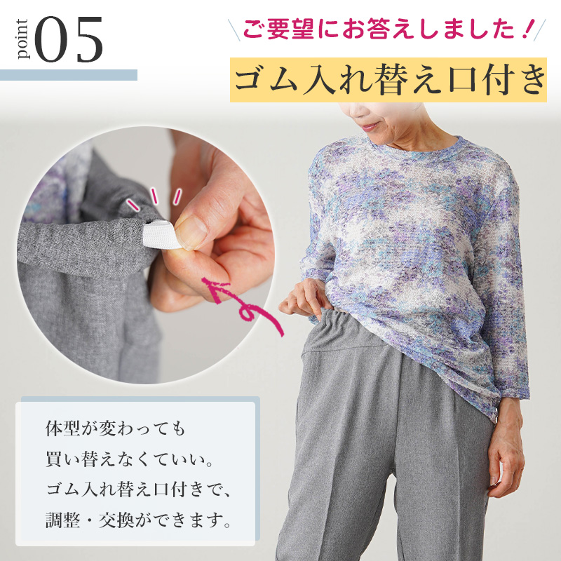●ウエスト総ゴムに加え、ゴム入れ替え口付きで体型変化にも対応。両側ポケット、センタープレスで介護服っぽく見えにくく、通院や面会の日もきちんと整う、レディース高齢者パンツです。