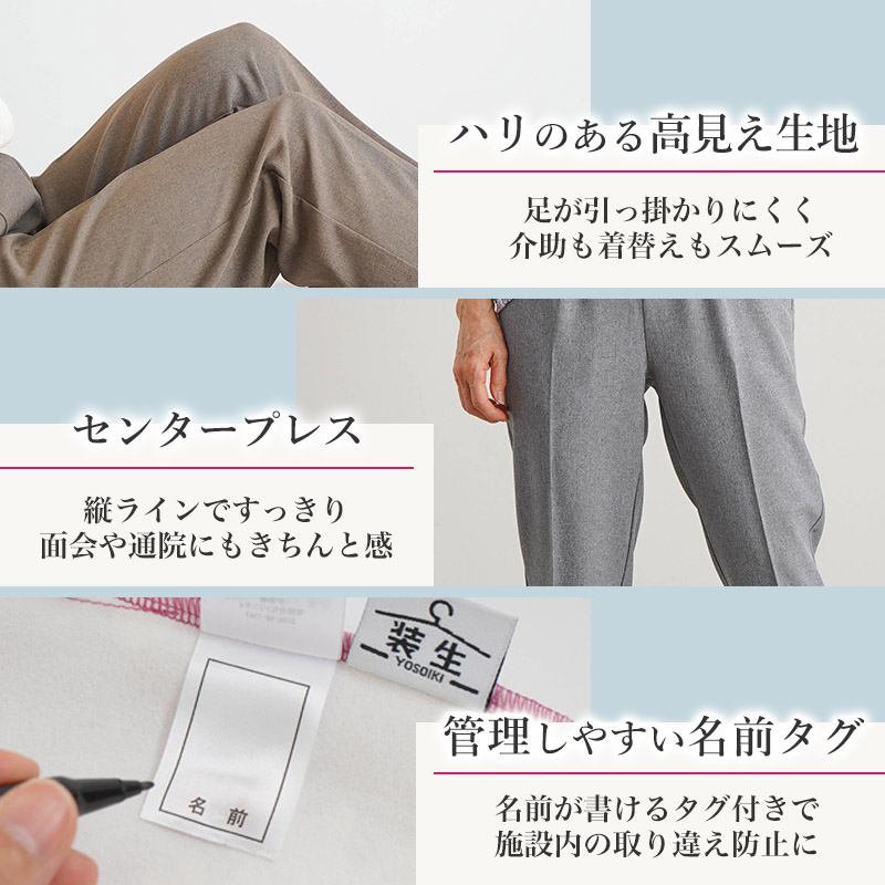 ●生地は杢調の高見え素材。伸びすぎない程よいハリで脚を通しやすく、介助の着替えもスムーズ。日常生活やリハビリ・運動のシーンにも向きます。