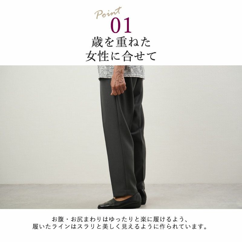履き心地を重視して型紙から独自改良・縫製されたシニアのための定番スラックス・総ゴムパンツ。お腹・お尻まわりはゆったりと楽に履けるよう、履いたラインはスラリと美しく見えるように作られています。毎日の着用やお洗濯にも耐えられるよう、耐久性と肌ざわりの良さを兼ね備えた素材選びから、質の高い国内縫製、またウエストゴムは国内のゴムメーカーと共同開発し、お洗濯にも耐える品質を満たしています。