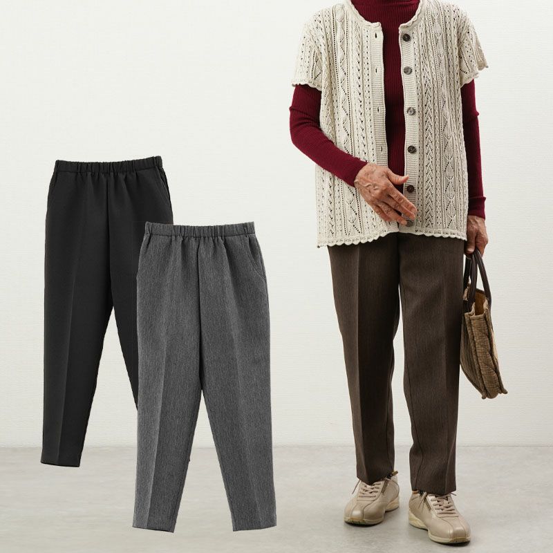 履き心地を重視して型紙から独自改良・縫製されたシニアのための定番スラックス・総ゴムパンツ。お腹・お尻まわりはゆったりと楽に履けるよう、履いたラインはスラリと美しく見えるように作られています。毎日の着用やお洗濯にも耐えられるよう、耐久性と肌ざわりの良さを兼ね備えた素材選びから、質の高い国内縫製、またウエストゴムは国内のゴムメーカーと共同開発し、お洗濯にも耐える品質を満たしています。