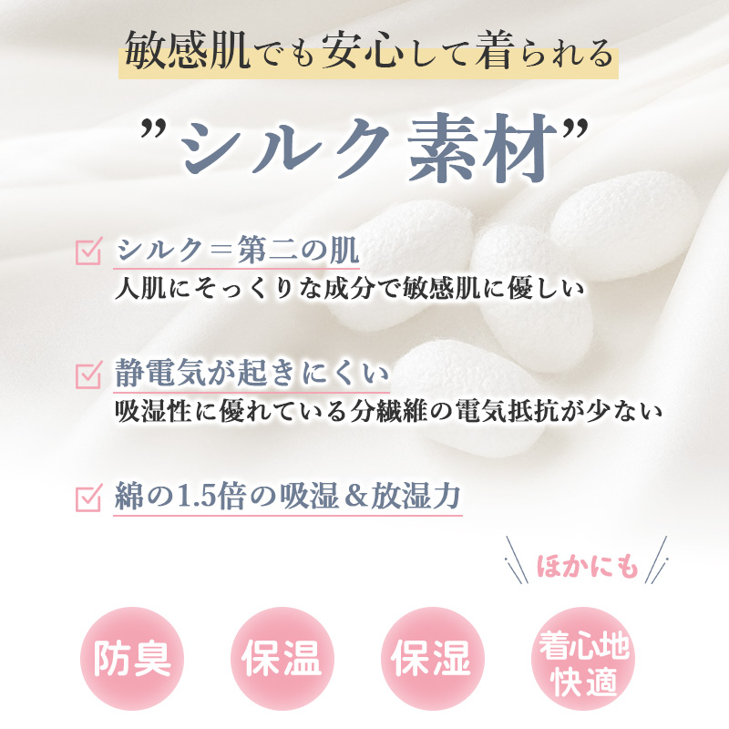 ●敏感肌の方にも安心して着用頂けるシルク100%カーディガン。第二の肌という通称があるほど肌と近しい成分を持っています。