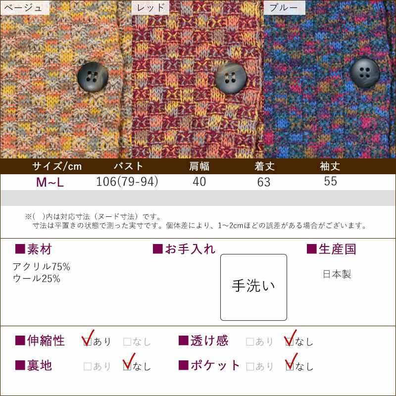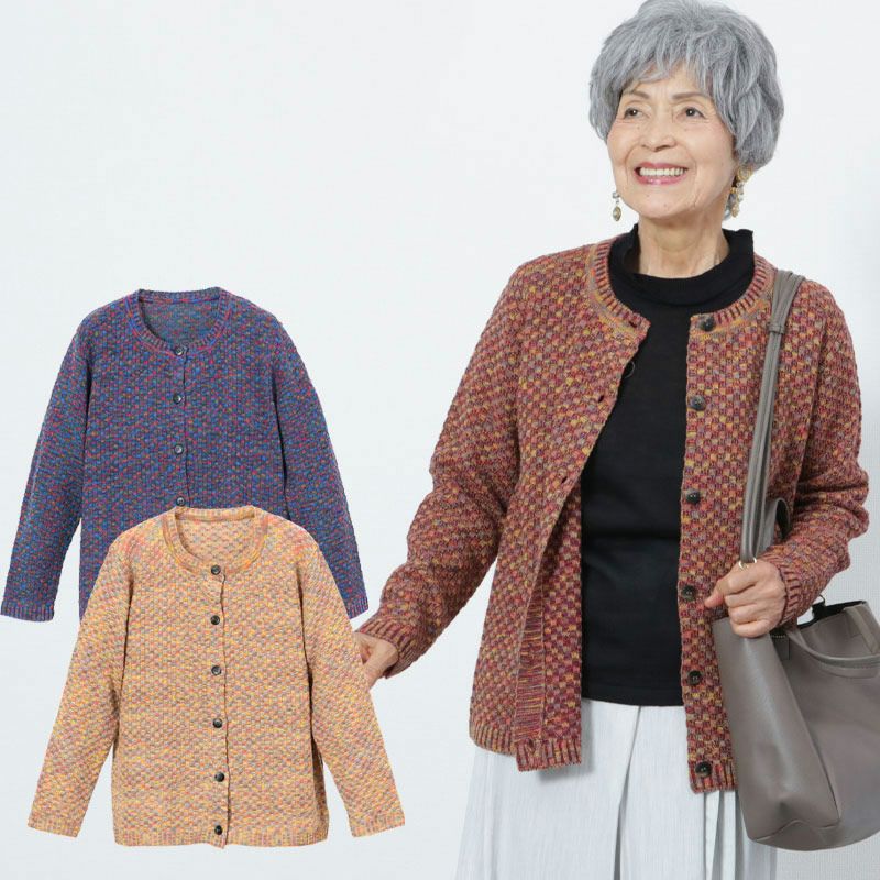 色とりどりの糸を市松模様に編み上げ、絶妙な色合いを表現したニットカーディガン。
