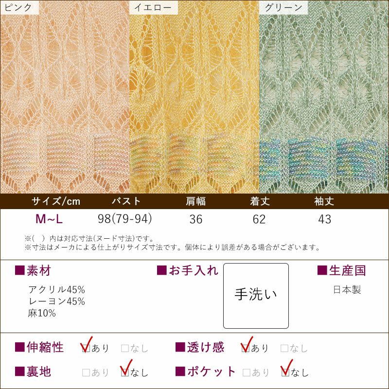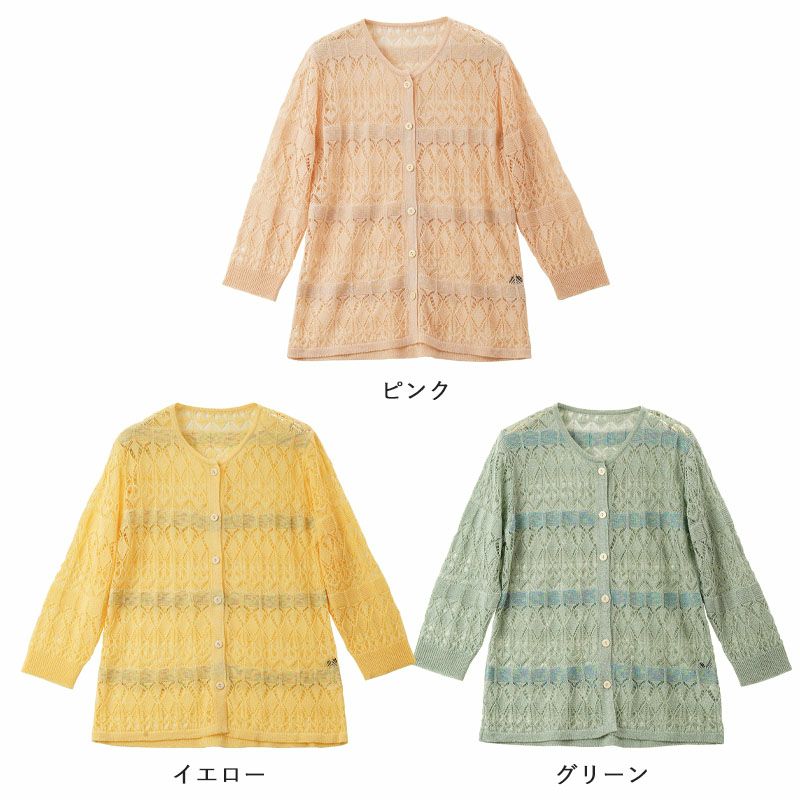 透かし編みが涼しげなサマーニットカーディガン。麻が入っているのでさらりとした手触りながら、冷房下でも活躍するサマーニットです。七分袖タイプで、夏の羽織物としてはもちろん、いつも袖丈が長いという小柄な方にもおすすめです。信頼の日本製でプレゼントにも喜ばれます。