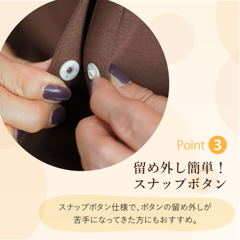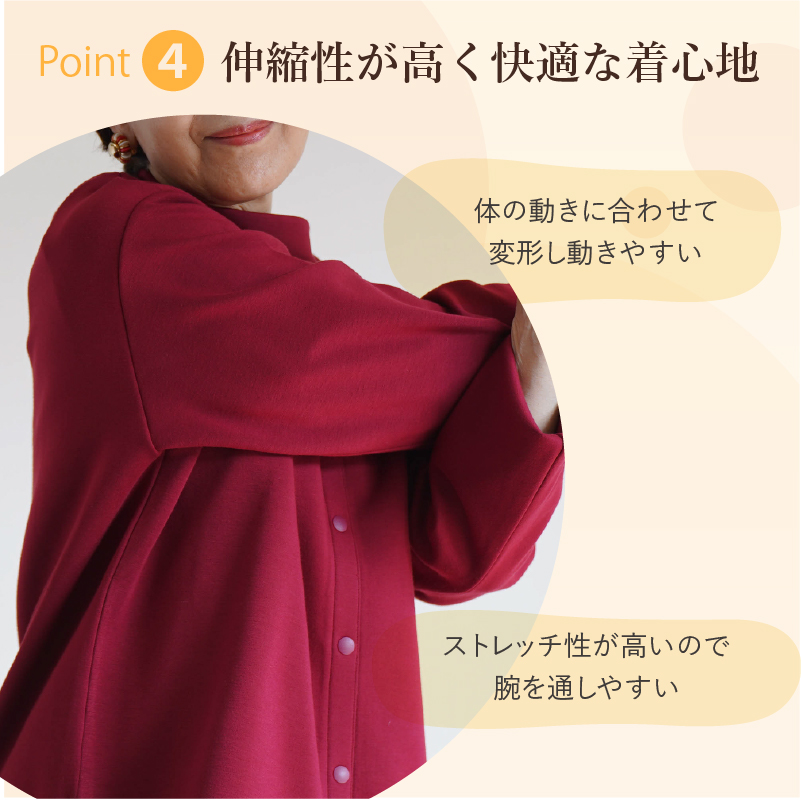 ●伸縮性が高い生地とすっきりした丸首デザインで、楽に着脱可能です。