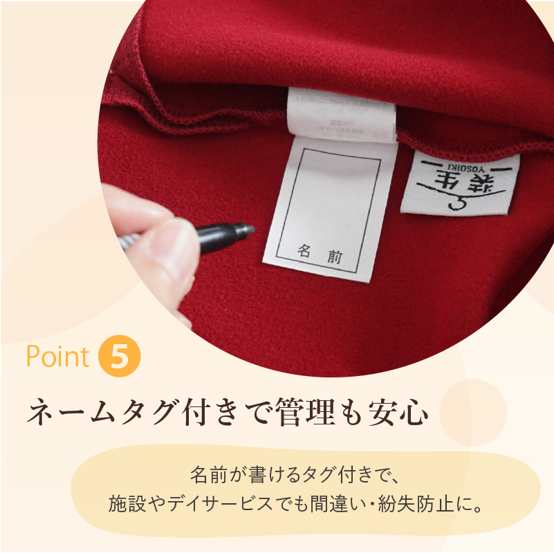 ●介護施設の入居者さまやショートステイ・デイサービスをご利用される方からご要望の多い名前の書けるネームタグを付属しています。
