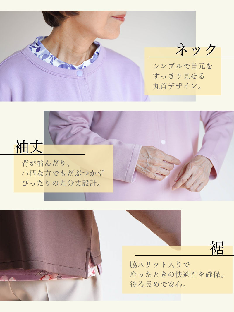 ●後ろ長め丈と脇裾スリットで体型を自然にカバーし、座っても窮屈にならない設計です。