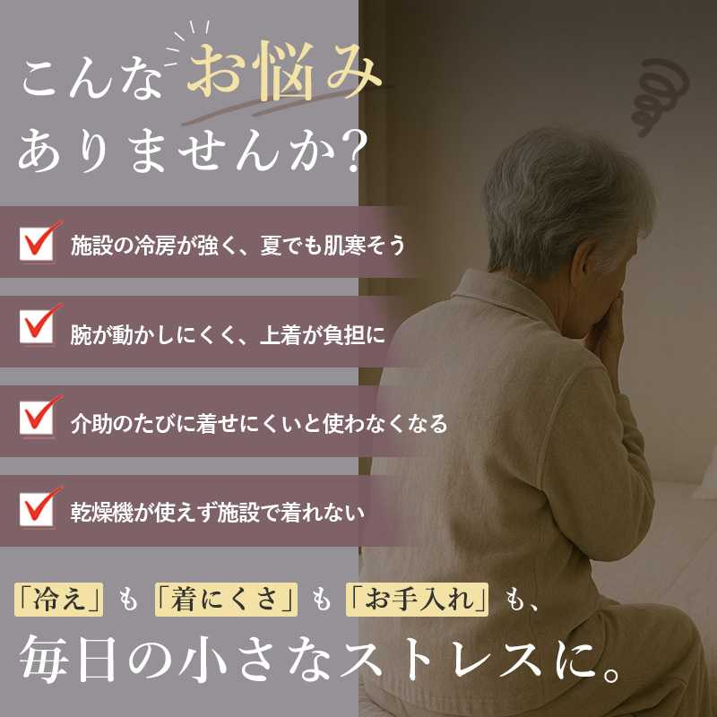 短め袖で手元が邪魔になりにくく、食事やレクリエーション時も快適に過ごせます。