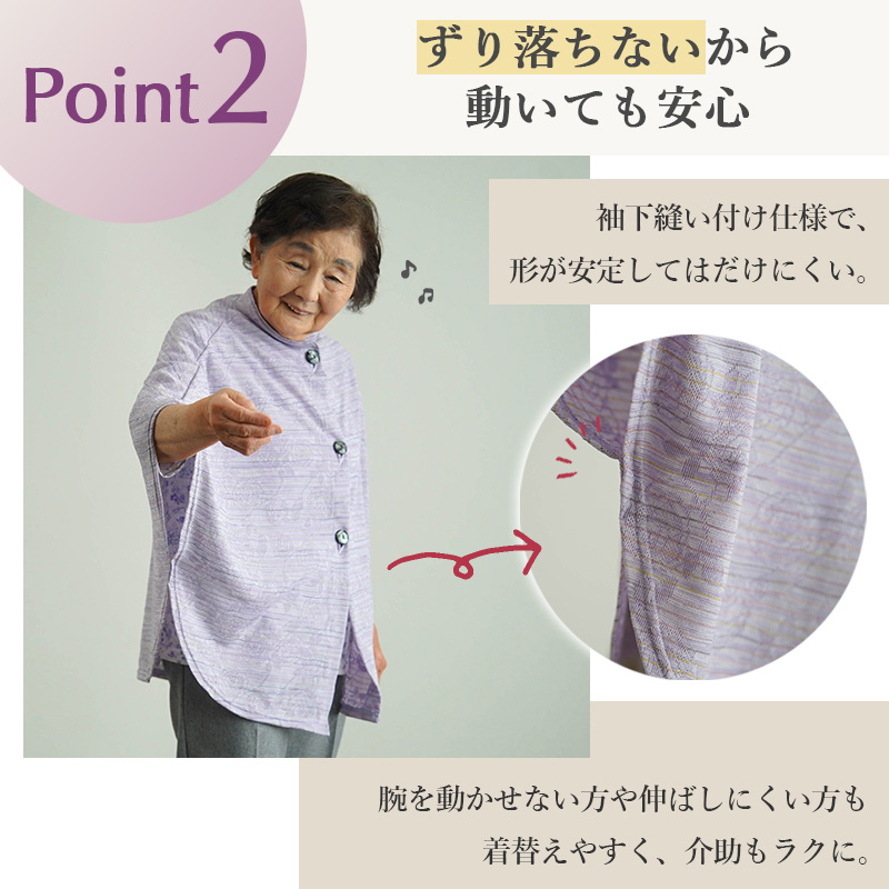 ● 袖下縫い付け仕様でずれにくく、はだけにくい設計。