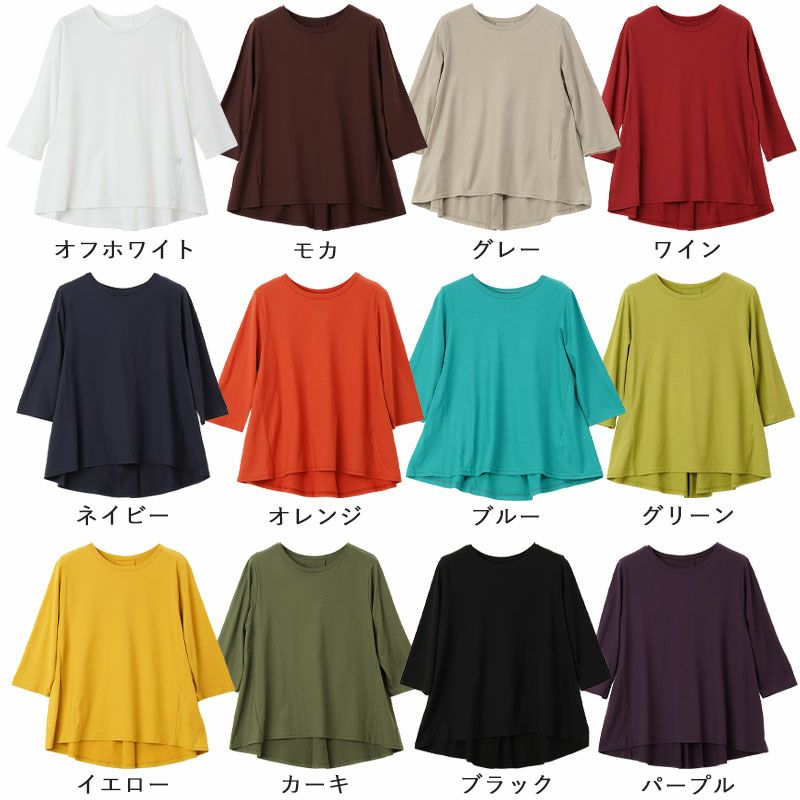 ひんやりと清涼感が感じられる加工を施した綿100%のAラインカットソー。首元が開きすぎず、詰まりすぎていないちょうどよい開き具合の春夏カットソーはなかなか見つからないものです。後ろ長め&タック入りでゆったりとお腹・お尻まわりをカバーしてくれます。袖は七分丈でどんな方にも着やすいですね。春夏の薄着になる季節もこれ1枚で様になります。カラーバリエーションが豊富で、信頼の日本製なのでプレゼントにもおすすめです。