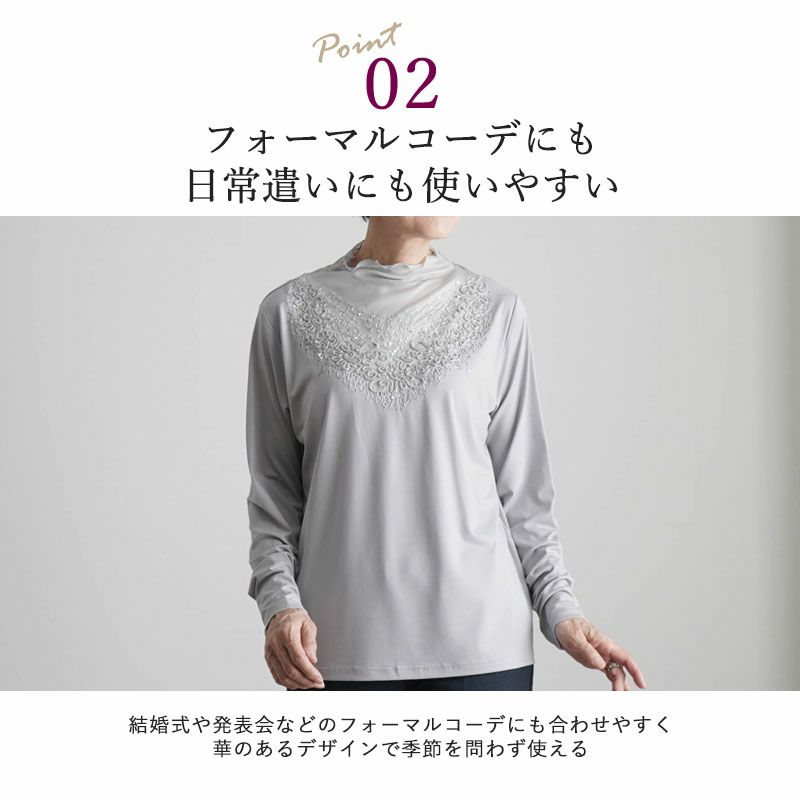●エレガントなメッシュ切替とスパンコール:ミニハイネックのチュールメッシュ素材が首元を上品にカバー。レースや小さなスパンコールが胸元を華やかに演出し、ネックレスなしでもお顔まわりを明るく見せます。