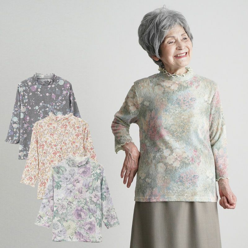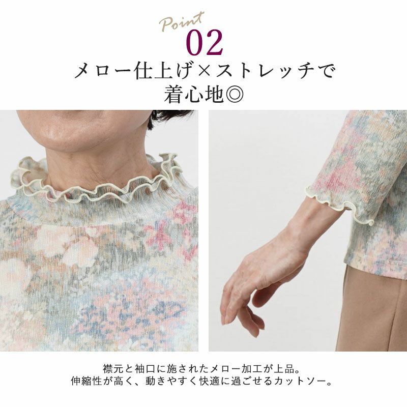 夏の装いを華やかに演出する、日本製楊柳素材のプリントカットソー。涼やかで心地よい着用感が特長です。