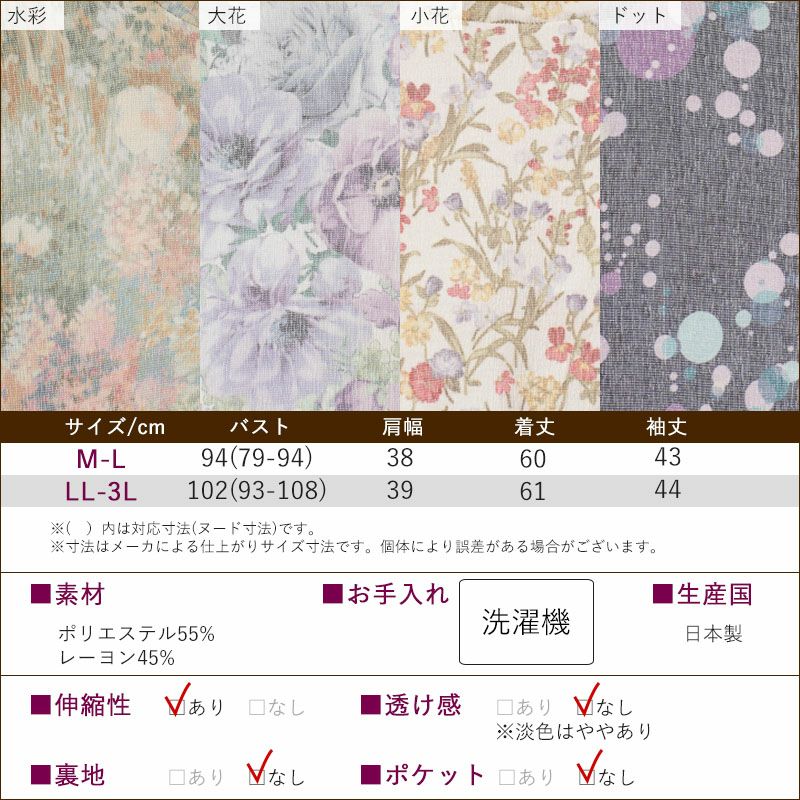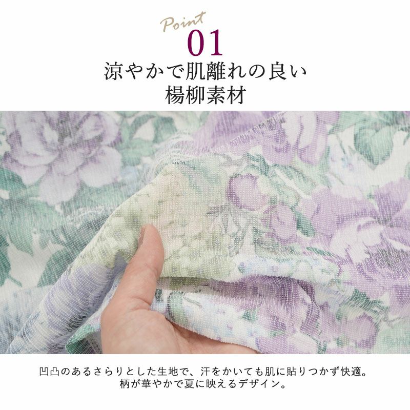 ●さらりとした楊柳素材に美しいプリントを施し、肌離れが良く暑い日も快適に過ごせます。凹凸感のある生地が、涼しげな印象を与えます。