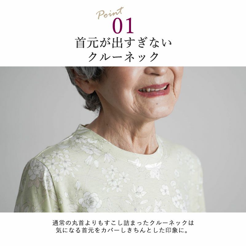 ●シニアにちょうどいいサイズ感:襟あきが丸首よりもちょっと詰まったややハイネックで気になる首回りをカバー。Sサイズ展開ありで小柄な方にも対応。