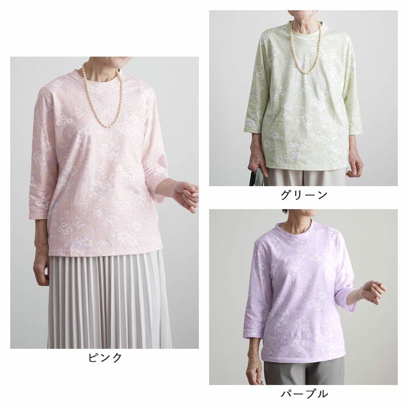 日本製 さらさら綿麻 花柄 七分袖 カットソー