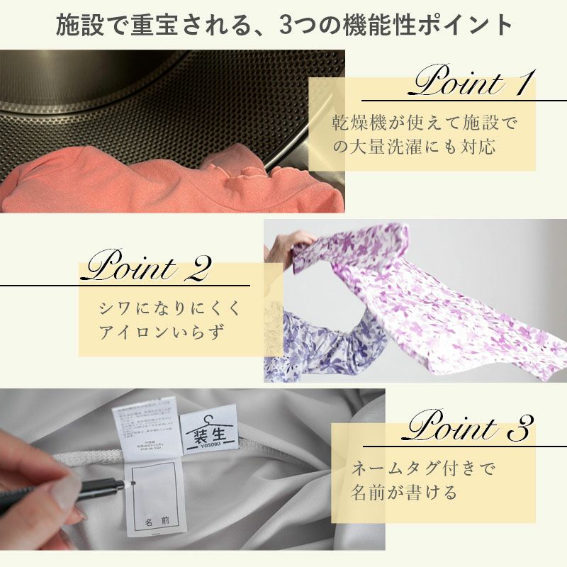 ●洗濯機洗いと乾燥機OKで、お洗濯後もシワになりにくく、老人ホームなどの施設でのお取扱いに最適です。