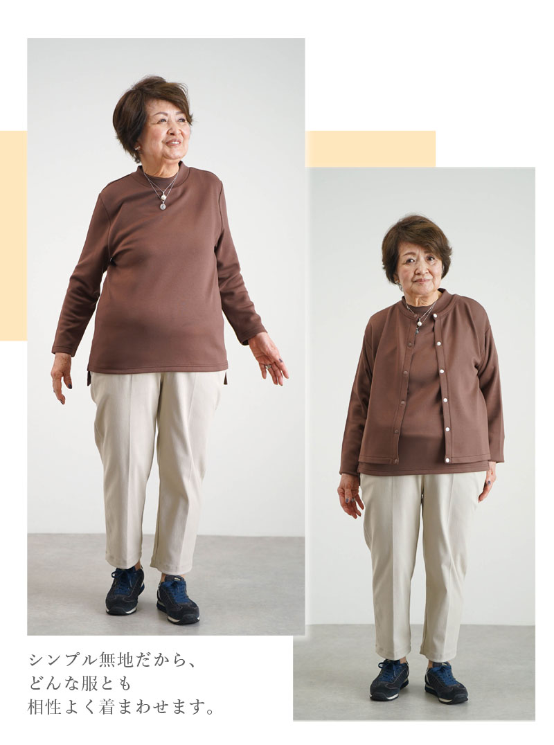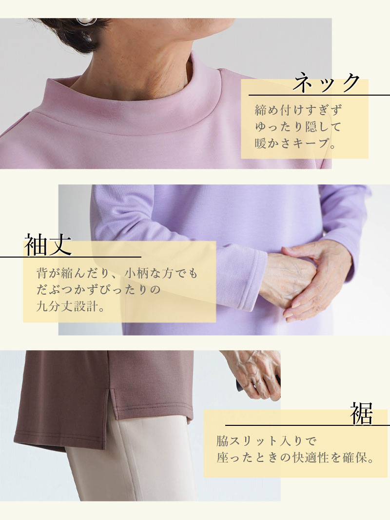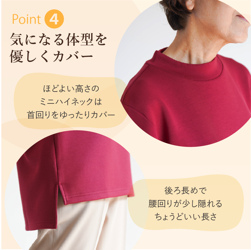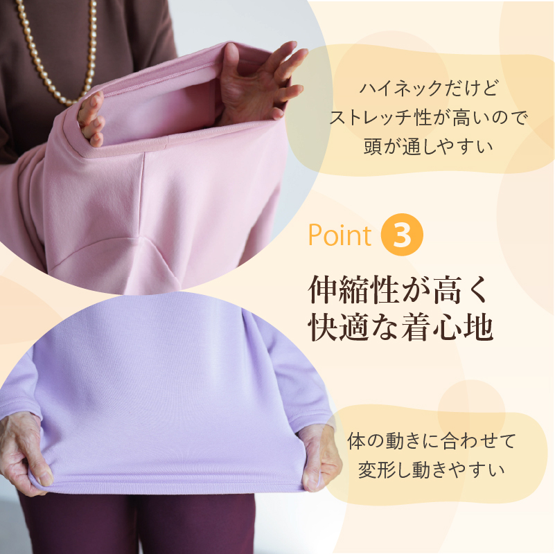 ●伸縮性が高い生地とミニハイネック仕様で、首元をやさしくカバーしながら楽に着脱可能です。