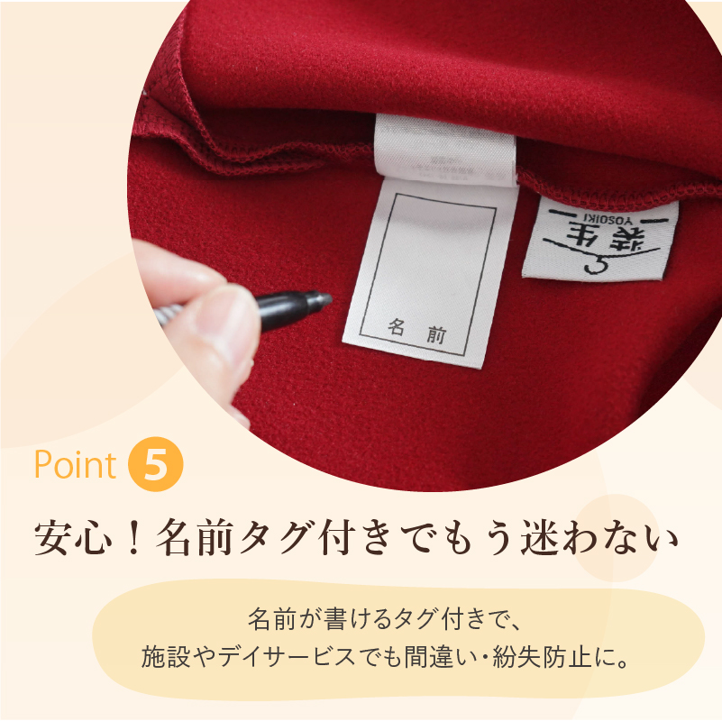 ●介護施設の入居者さまやショートステイ・デイサービスをご利用される方からご要望の多い名前の書けるネームタグを付属しています。