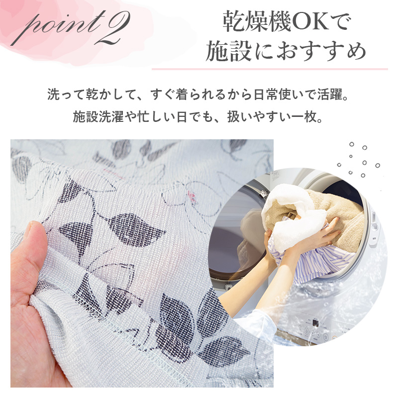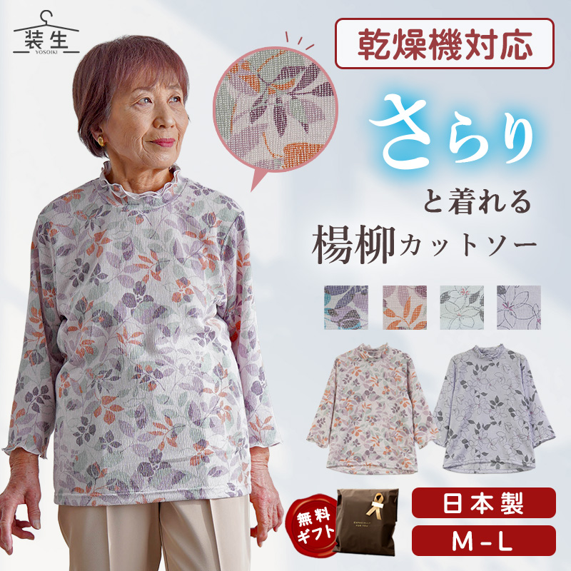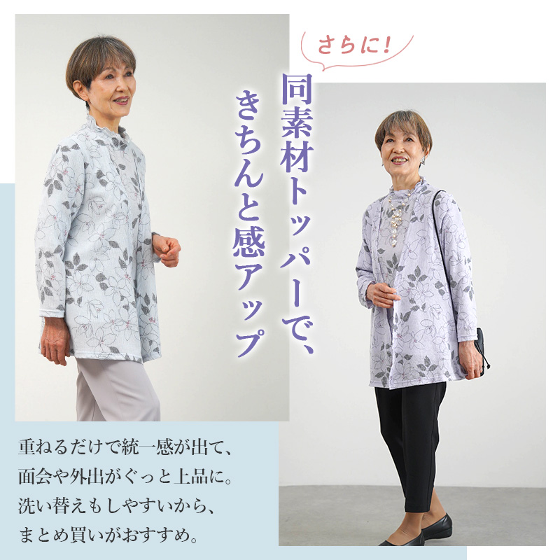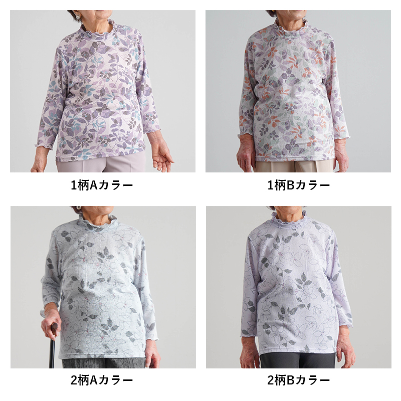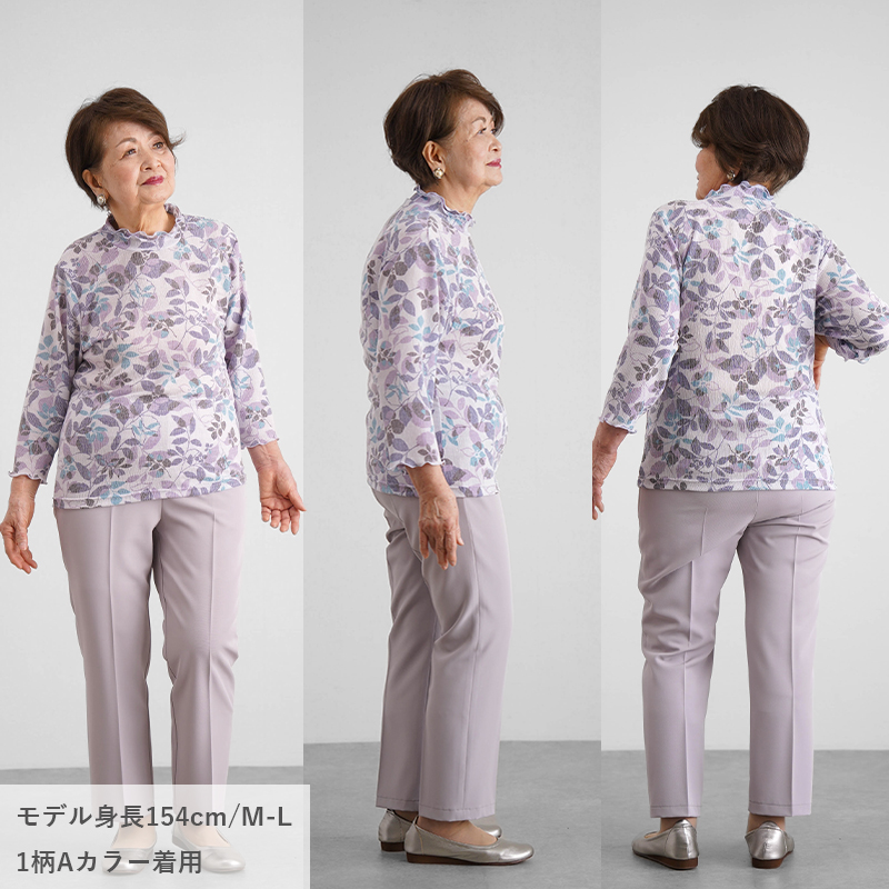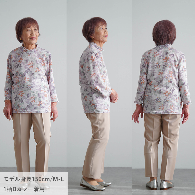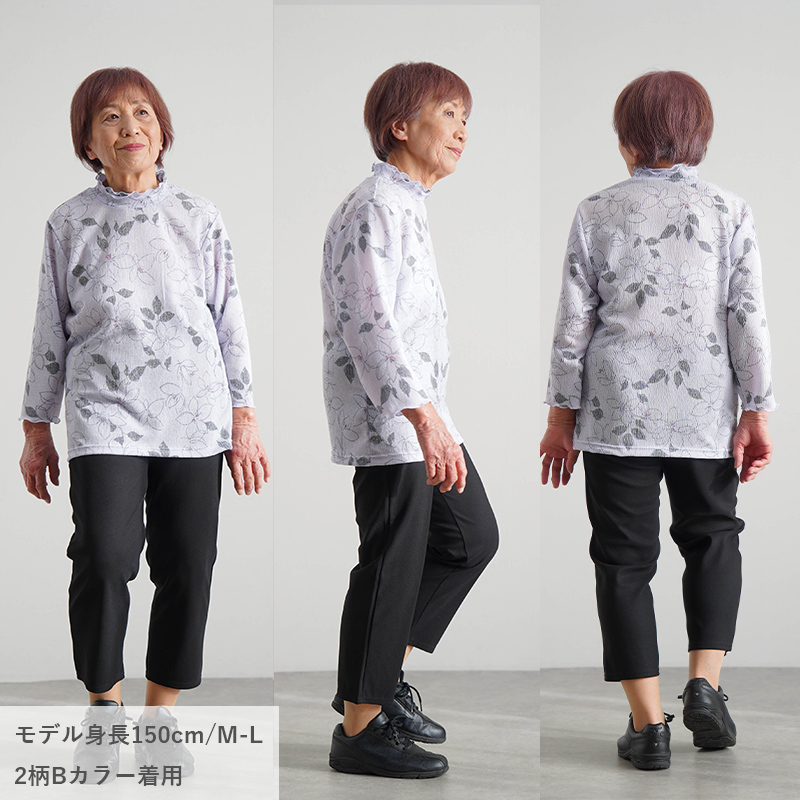 ● 肌にぺたっとしにくい楊柳(ようりゅう)素材の花柄カットソー。さらりと涼やかな着心地で、春夏の施設内でも気持ちよく着られます。