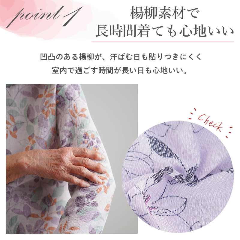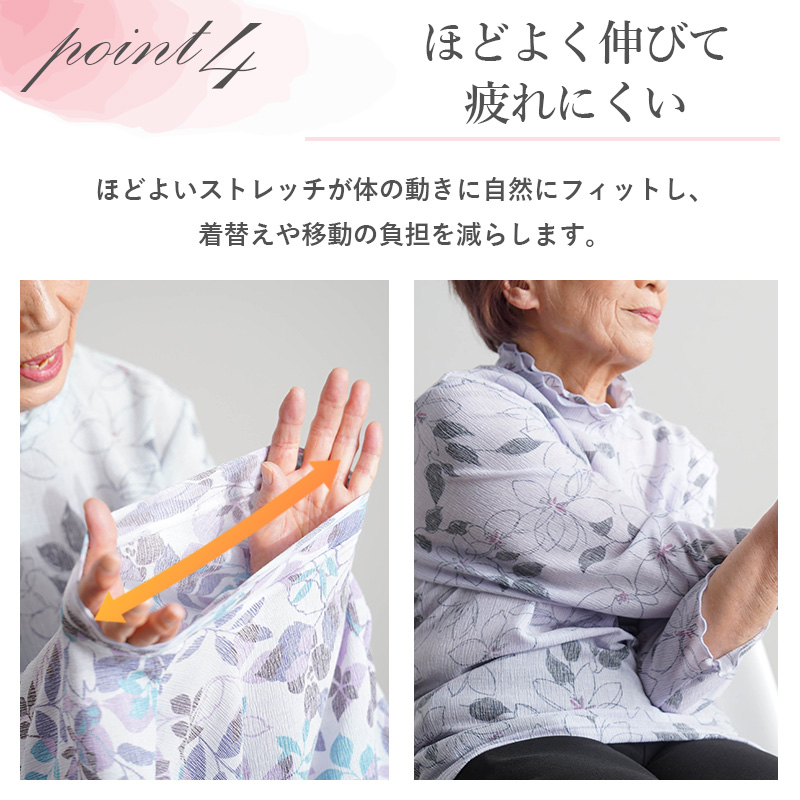 ● 7分袖で手元がもたつきにくく、食事や身の回りの動作もスムーズ。冷房の風よけにもなり、室内で過ごす時間が長い方におすすめです。