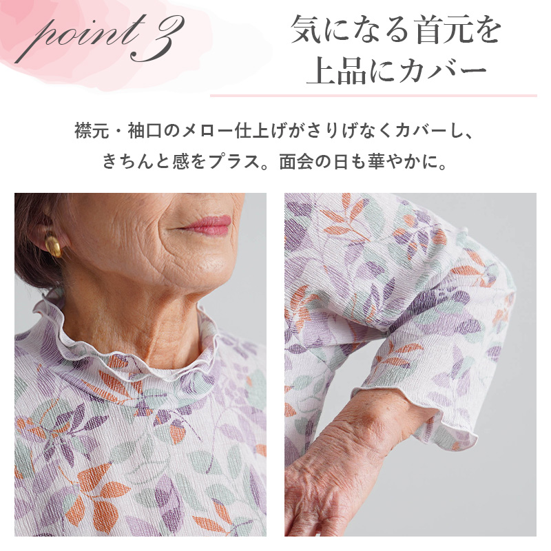 ● 首元と袖口はメロー仕上げで、やさしく首元をカバーしながら上品な印象に。顔まわりが明るく見えて、面会の日もきちんと整います。