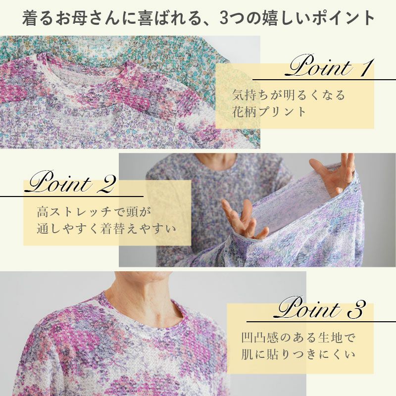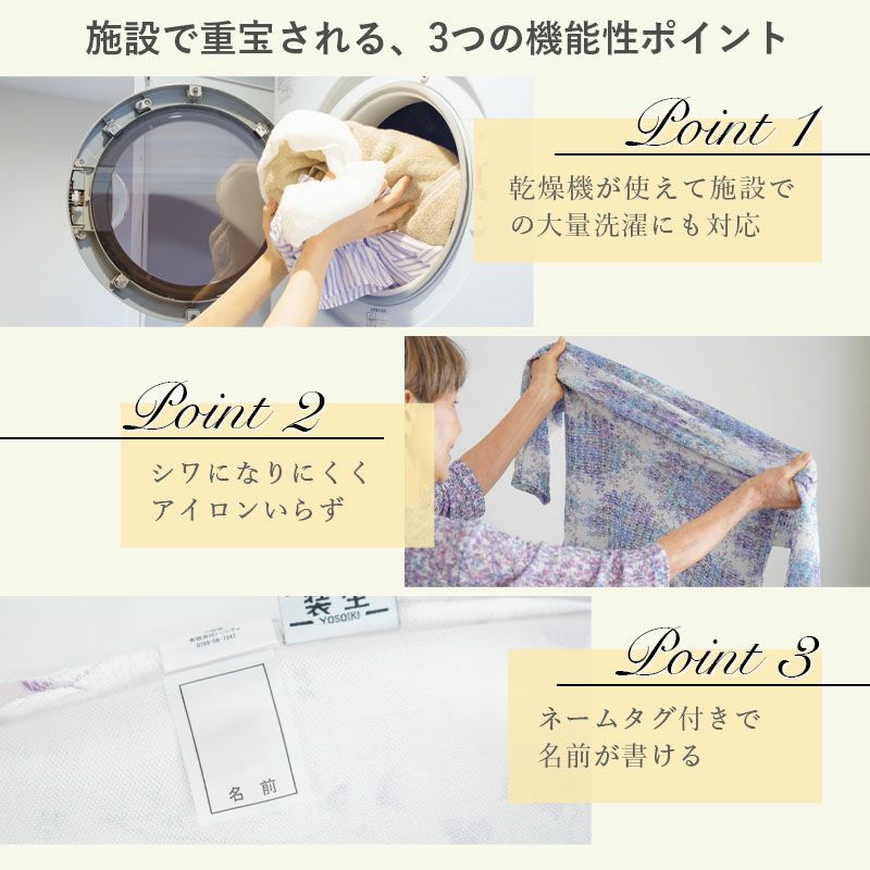 ● 気持ちが明るくなる華やかな花柄デザイン。 乾燥機対応に加えてネームタグ付きなので、施設での衣類管理もしやすく、普段着からおでかけまで幅広く活躍します。日本製で贈り物にもおすすめです。