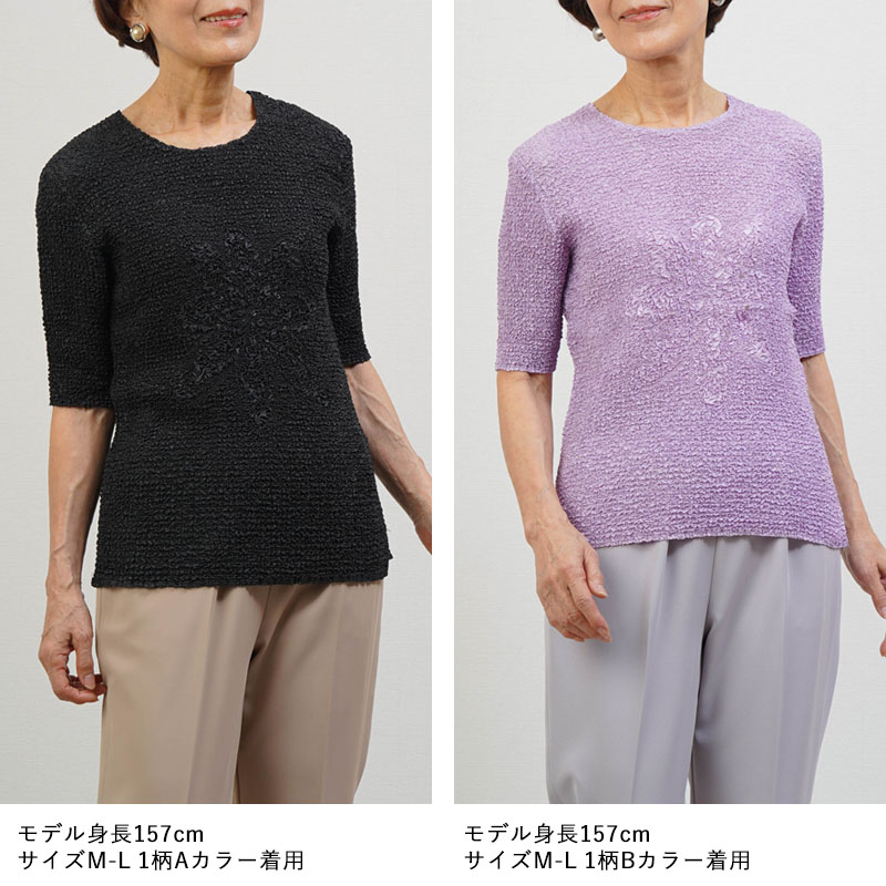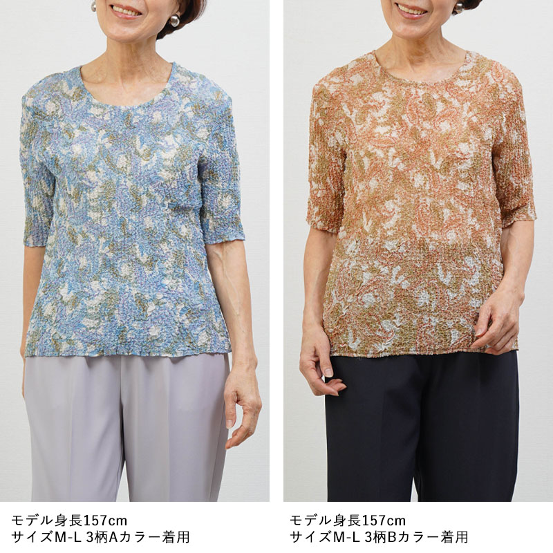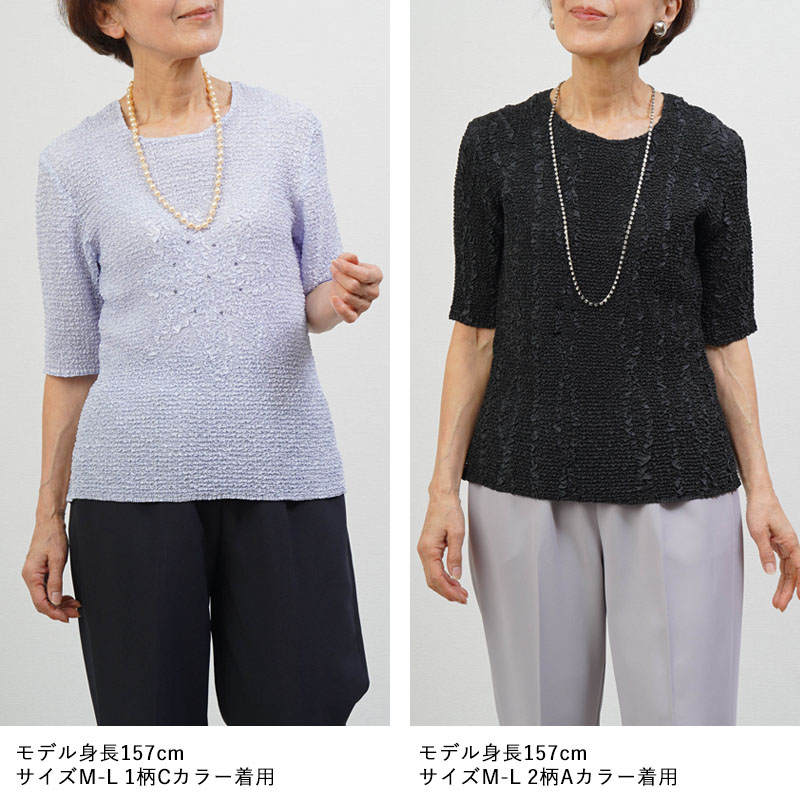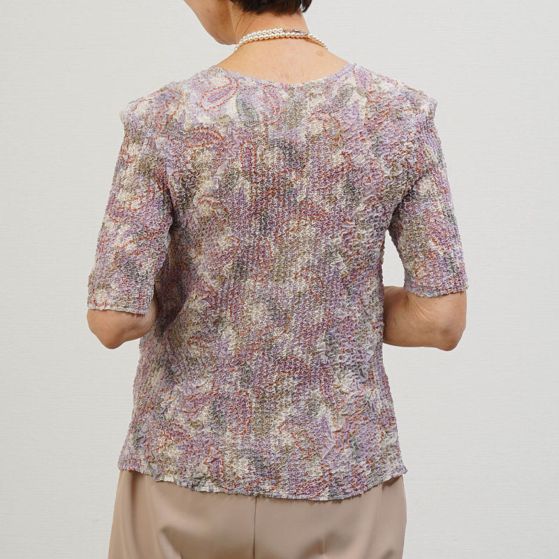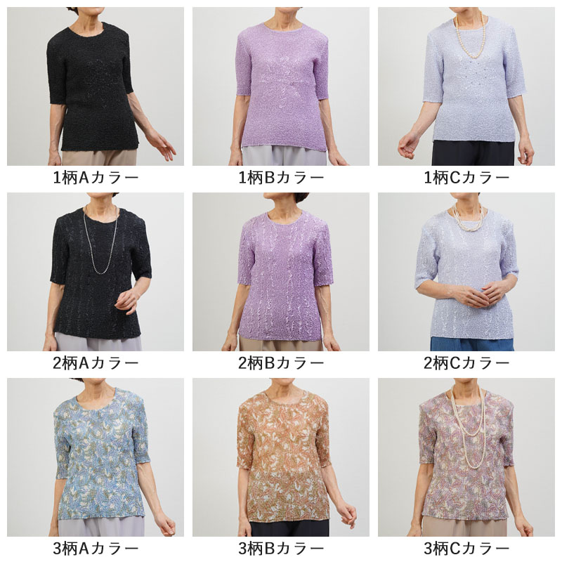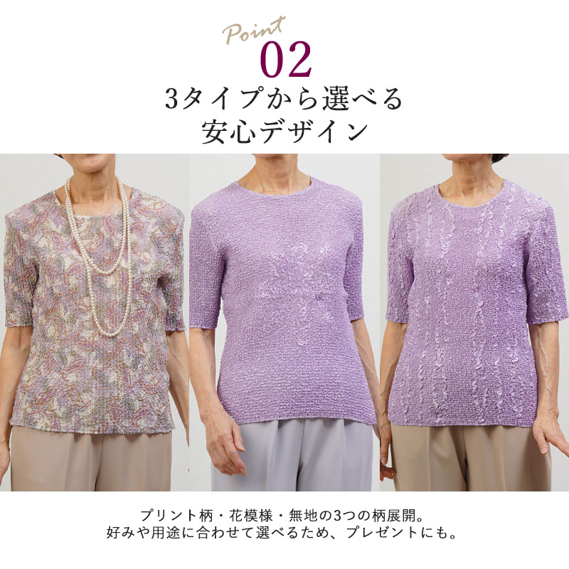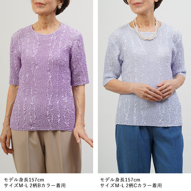 全体に均一なシワ加工を施したプリーツ五分袖カットソー。高い伸縮性があり、体の動きにやさしくフィット。80代以上の方でも楽に着られる着心地です。