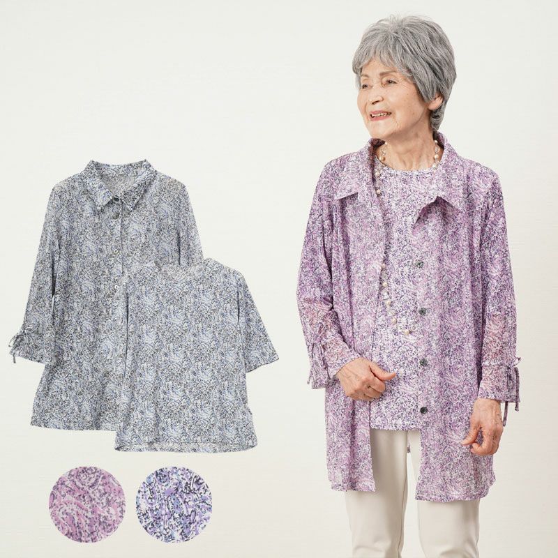 ●透け感のあるメッシュのロング丈ブラウスと、同柄のカットソーをセットにしたアンサンブル