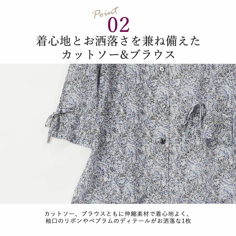 ●伸縮素材で着心地よく、ブラウスはゆったりした袖にひらひらしたペプラムとリボンがついてお洒落要素がたっぷり