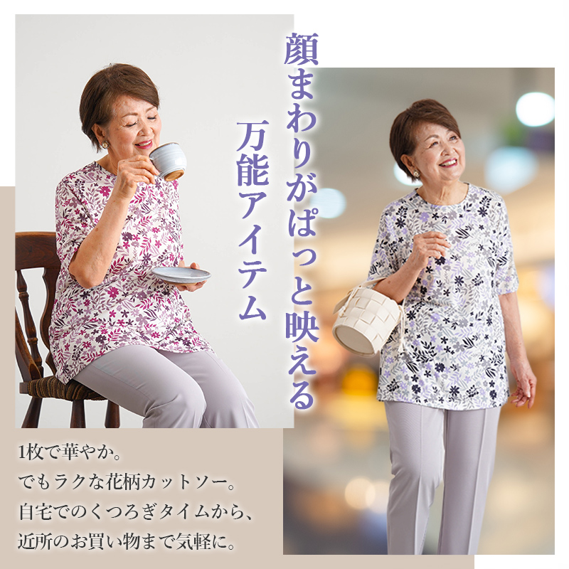 花柄が顔まわりを明るく見せ、1枚でもほどよく華やぎます。