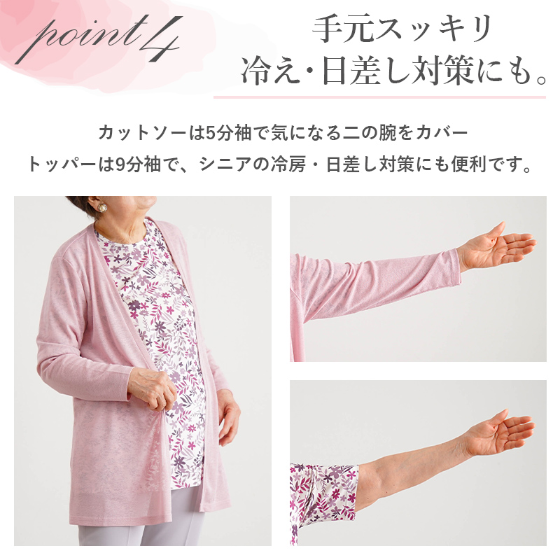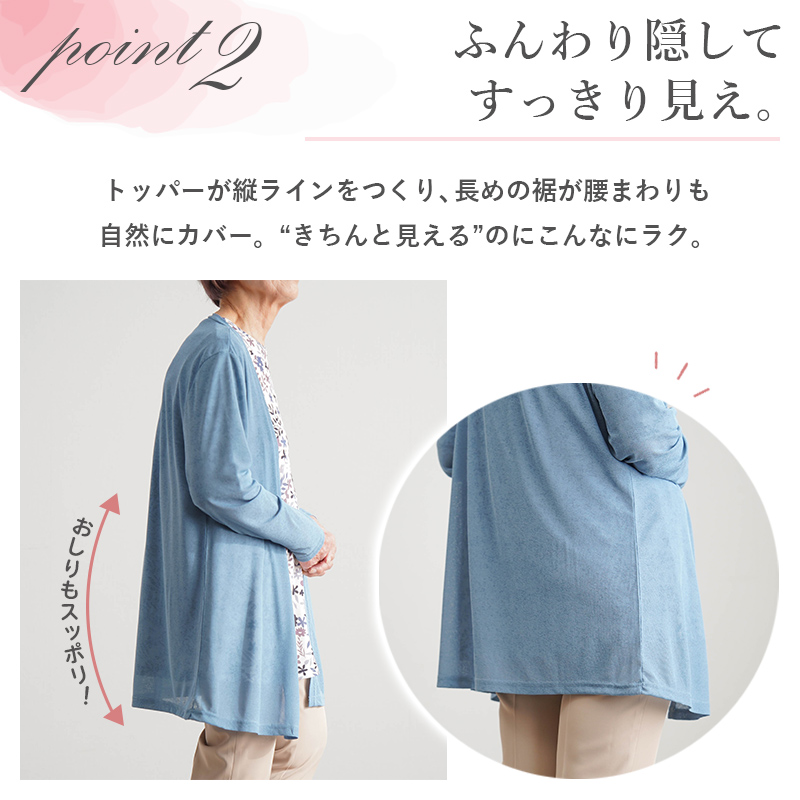 ●トッパーカーディガンは9分袖で、冷房の冷えや日差しが気になる日にもさっと羽織れて便利。