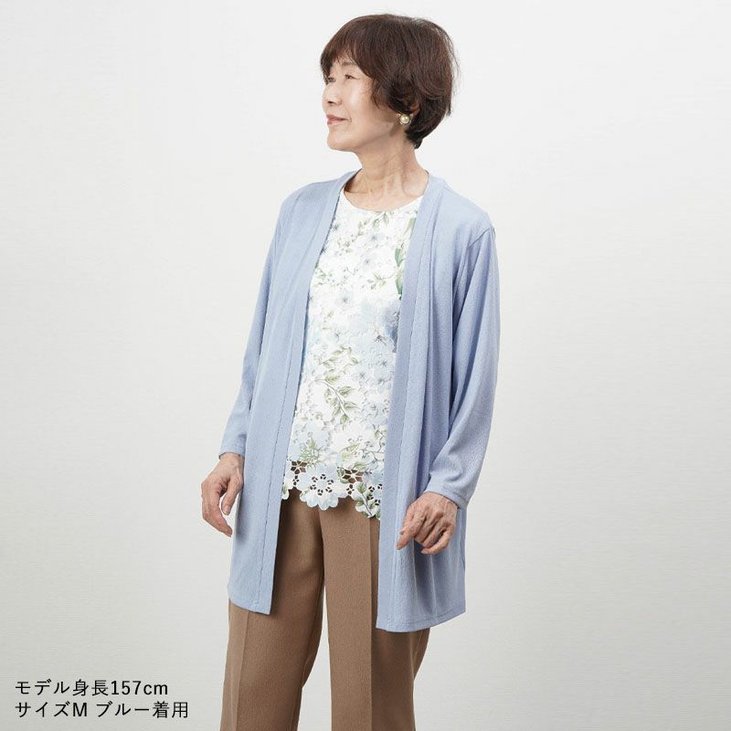 ●色を揃えた七分袖のカーディガンは伸縮性があり、肌触りがさらりとしています。冷房対策にも最適で、コーディネートを簡単にまとめ上げます。