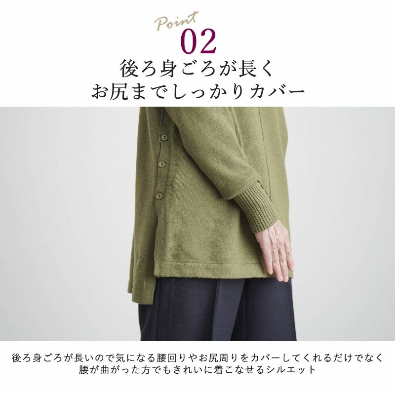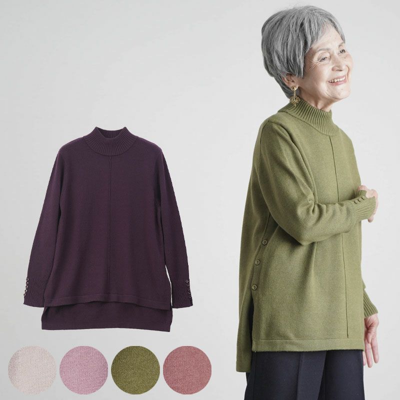 ●おしゃれなボタンデザイン:袖口や脇にあしらわれたボタンがアクセントとなり、おしゃれな印象を与えます。脇にスリットが入っているので、座ってもお腹周りが窮屈にならず、車椅子など座り姿勢の方にもぴったりです。