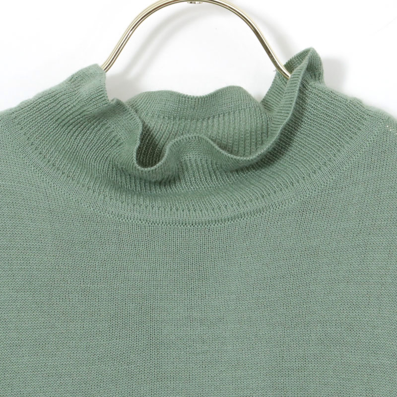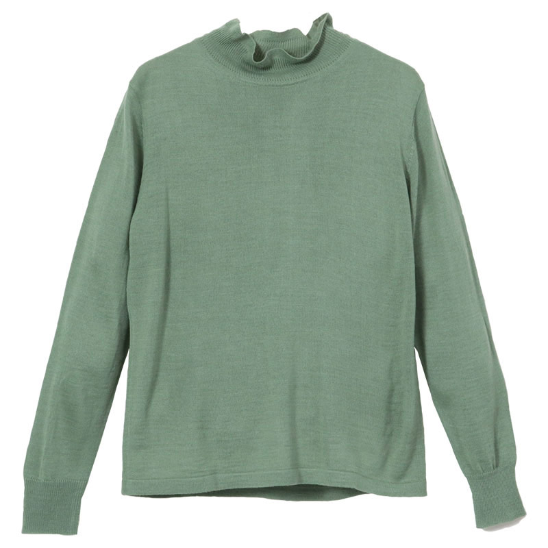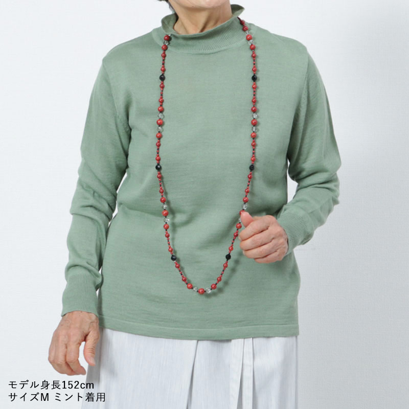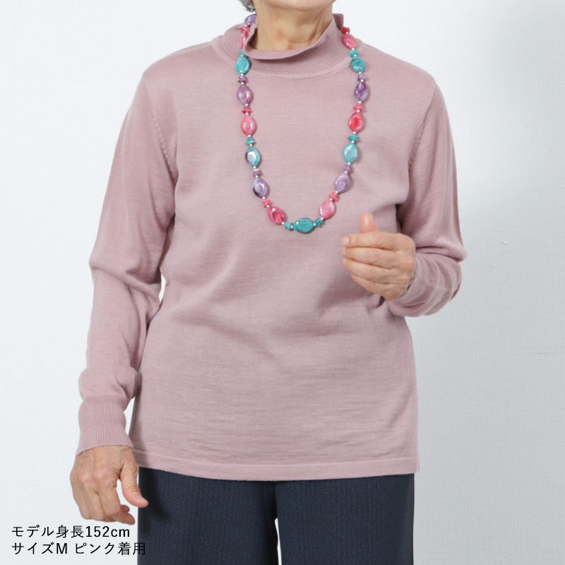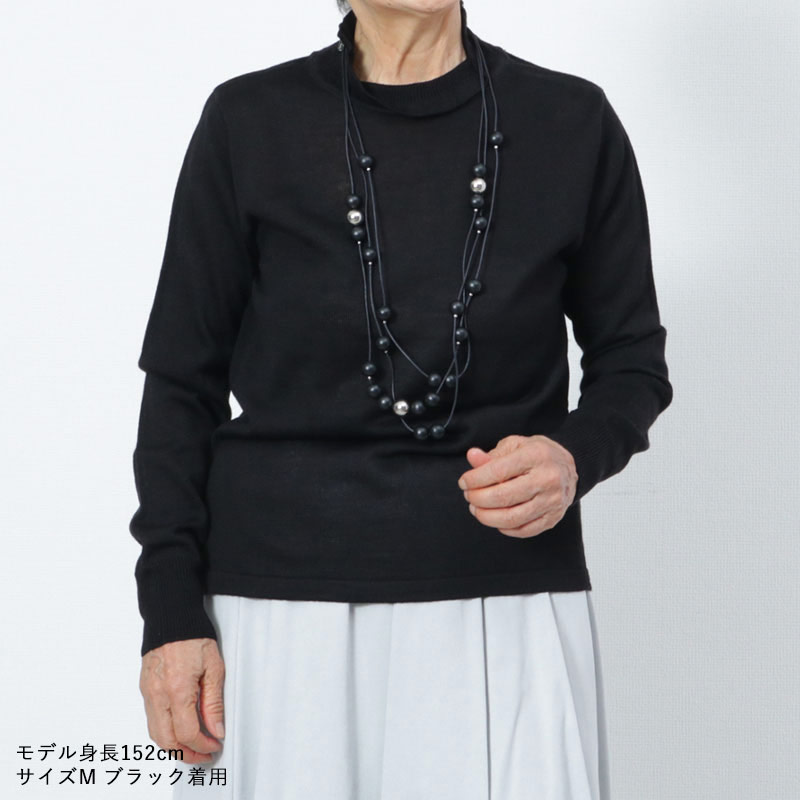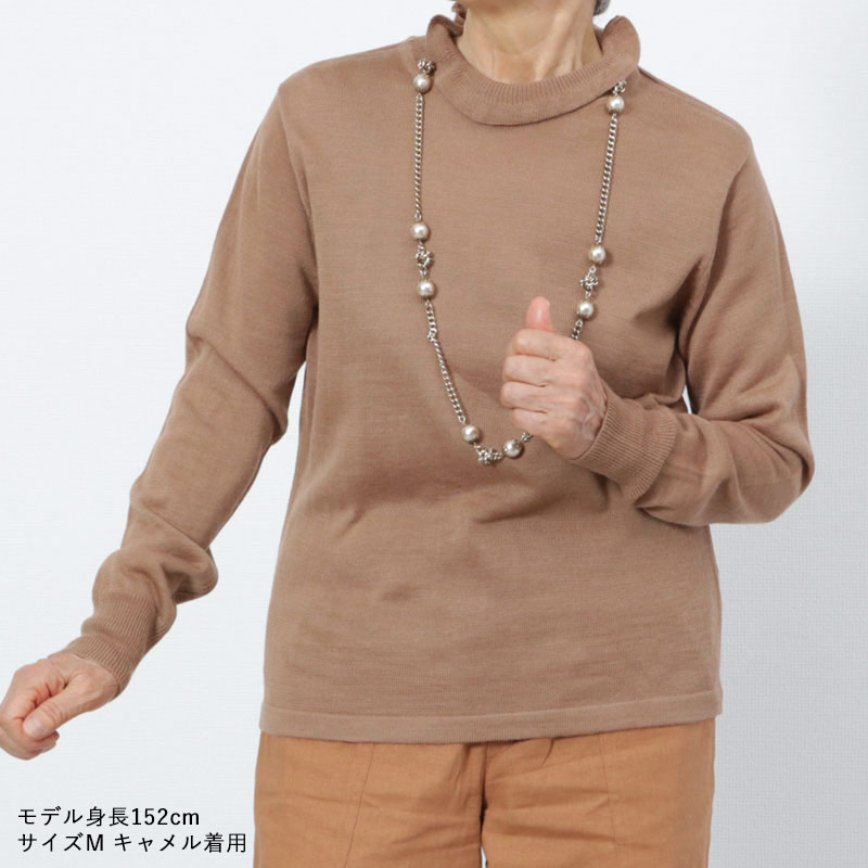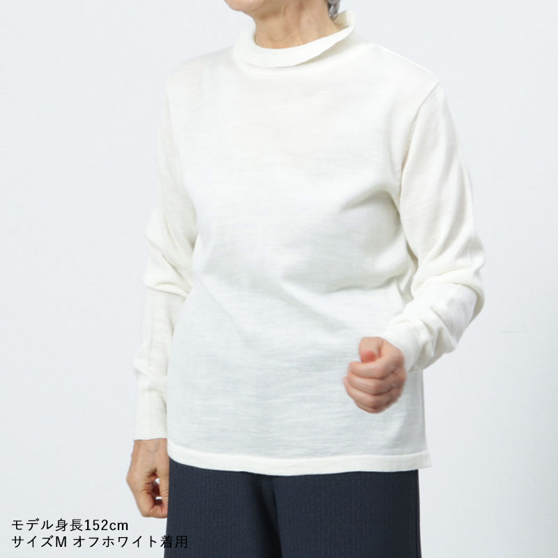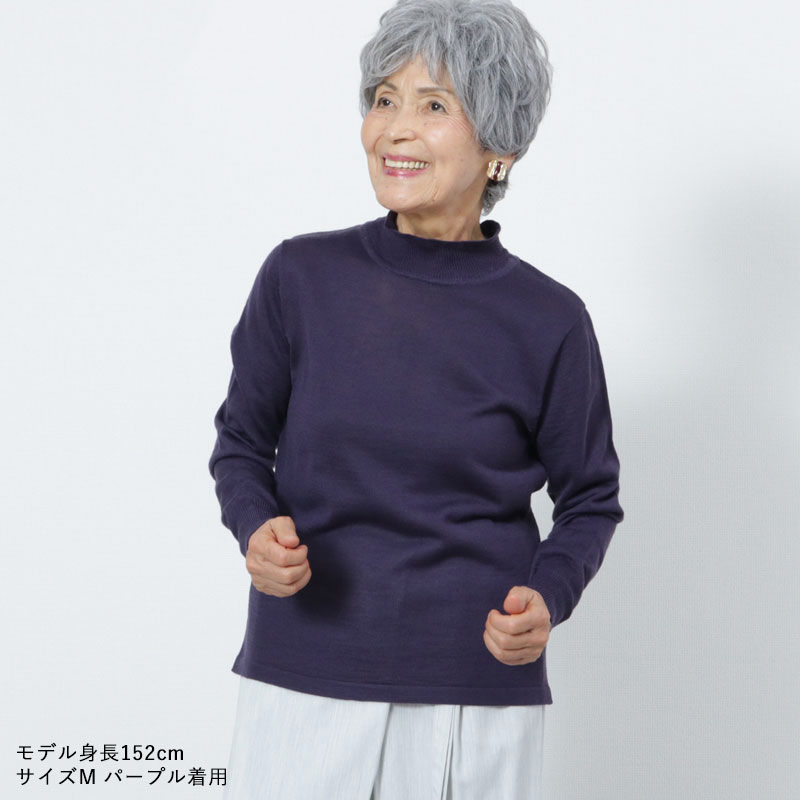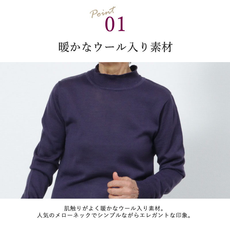 肌触りがよく暖かなウール入り素材。人気のメローネックでシンプルながらエレガントな印象。