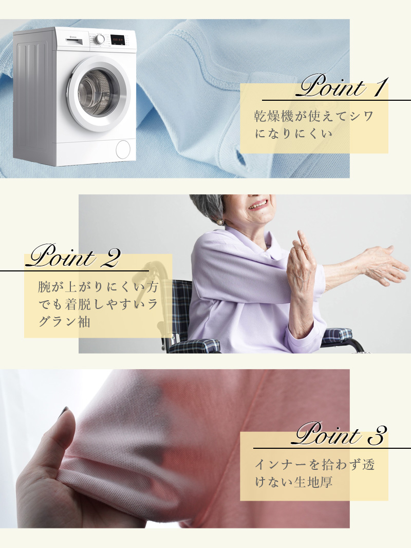 ●腕が上がりにくい方でもラクに着られるラグラン袖。
