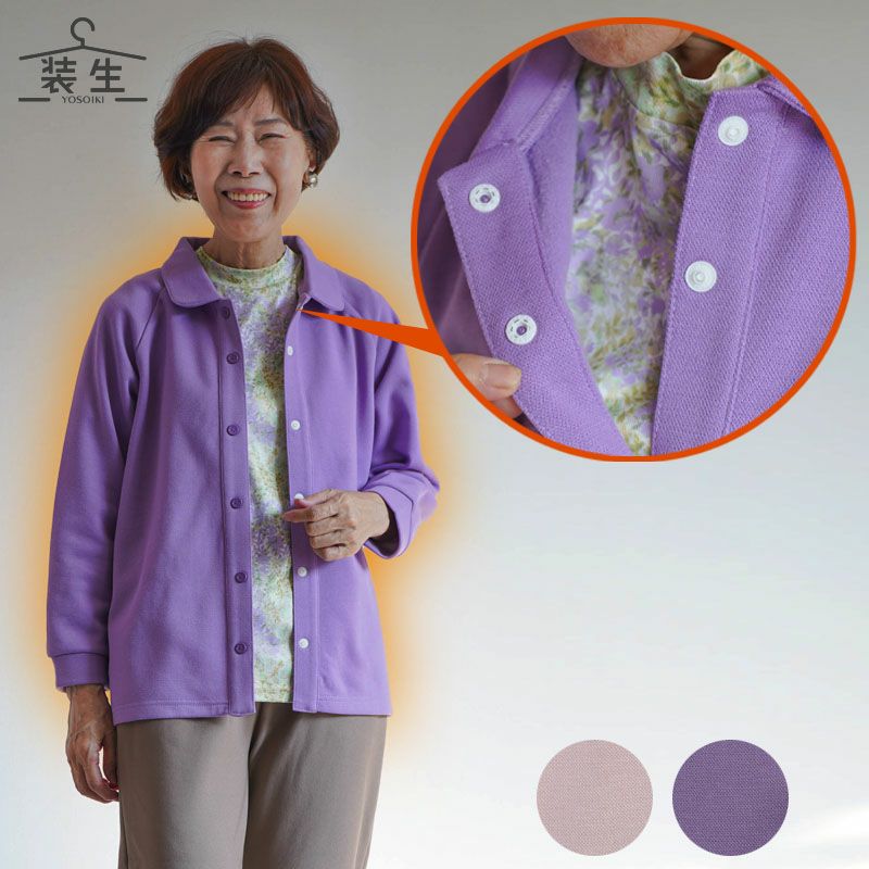 ●ワンタッチで留め外し可能なスナップボタン採用。。袖口が短めなので袖口がもたつかず名前が書けるタグも付いているので、介護施設でも大変好評です。