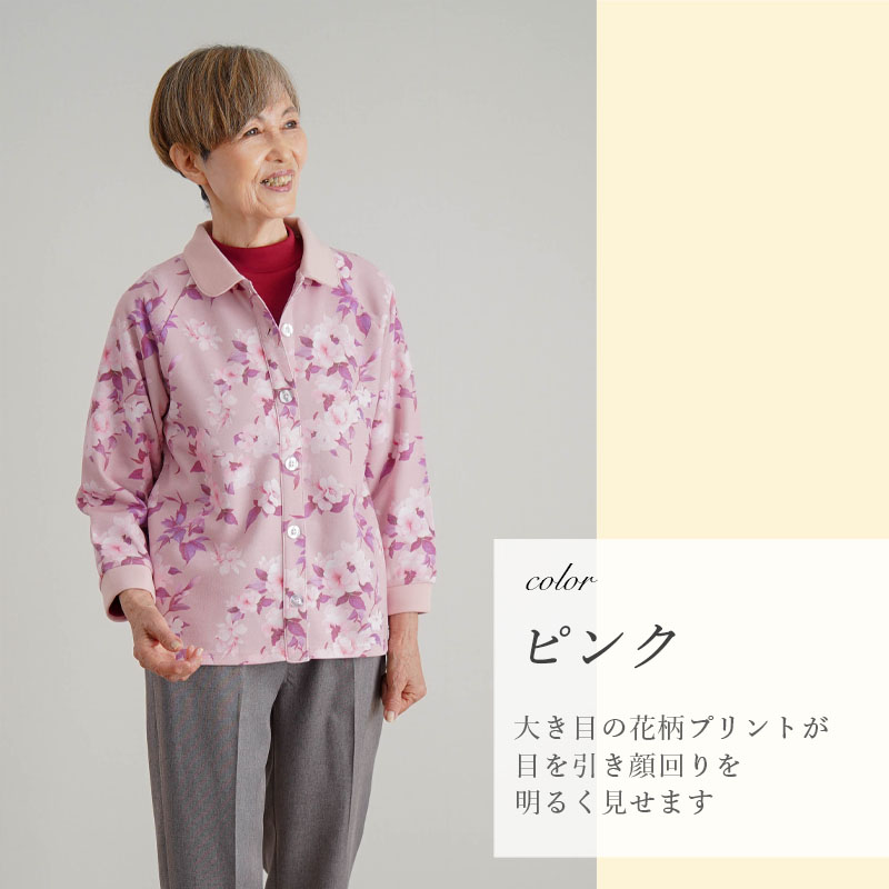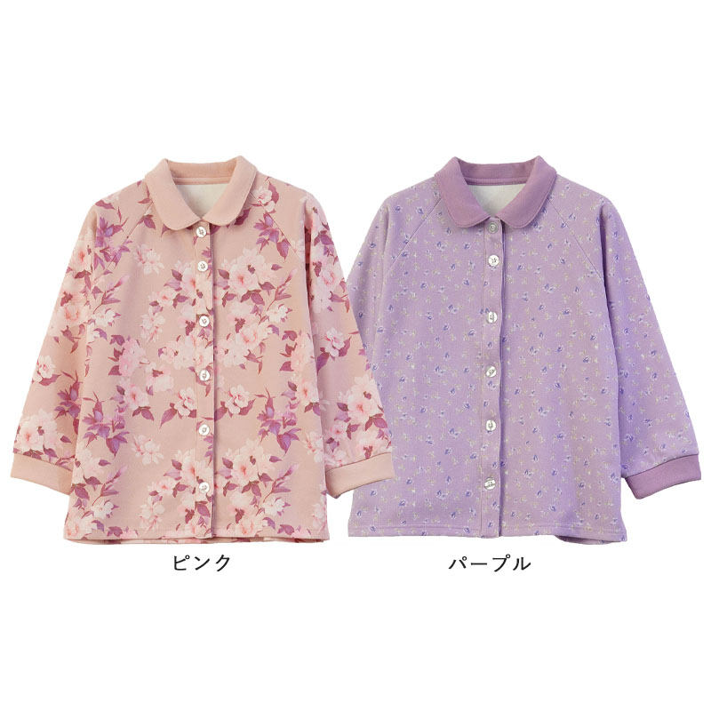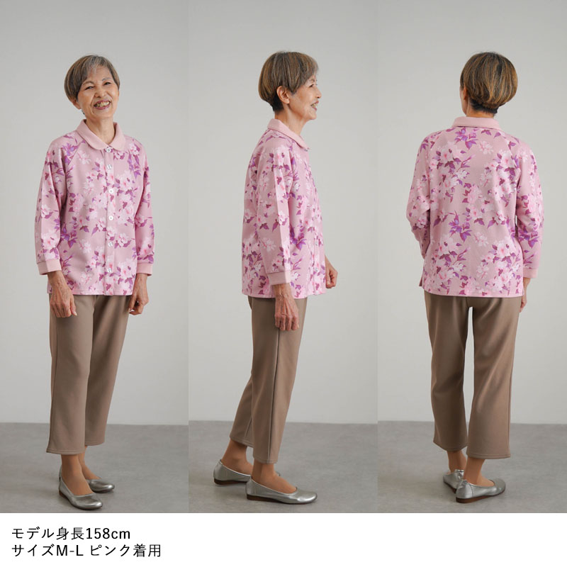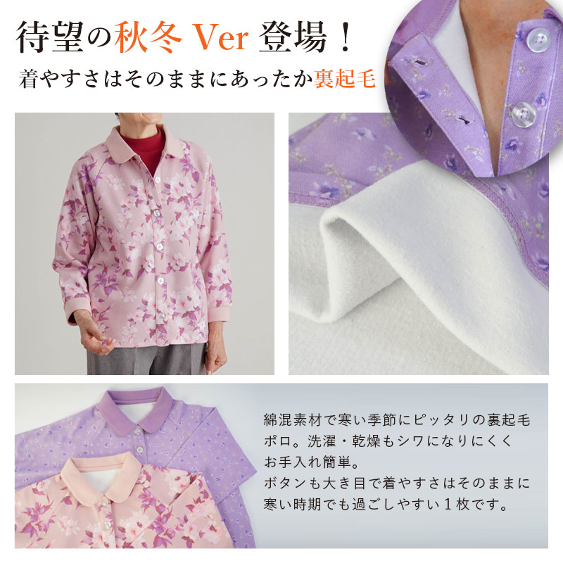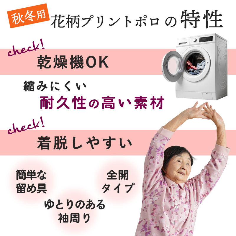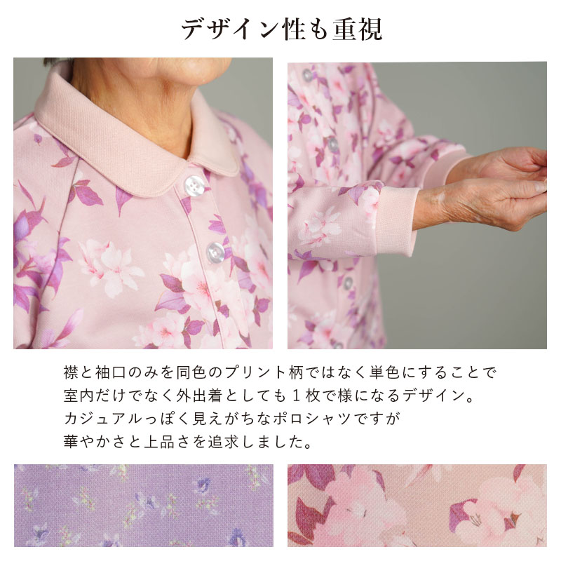 [装生] 乾燥機対応 裏起毛 花柄プリント 前開き ポロシャツ