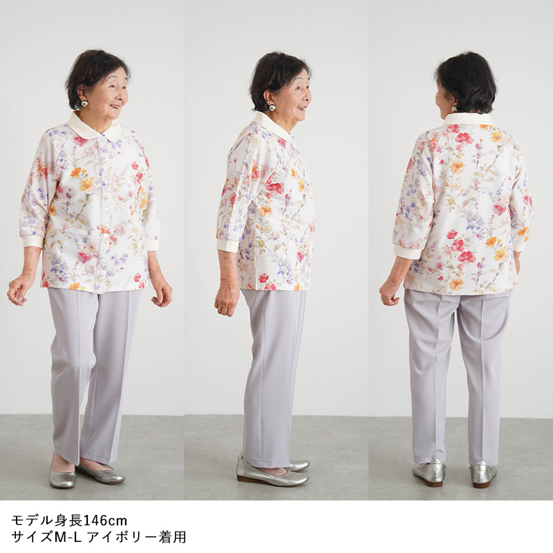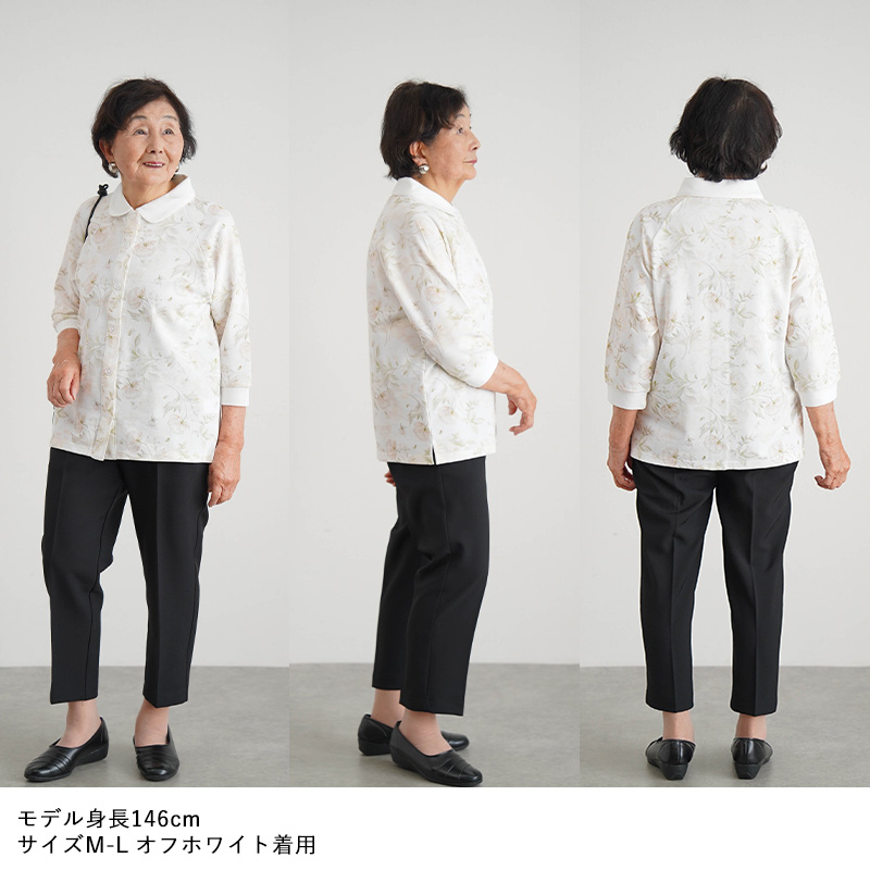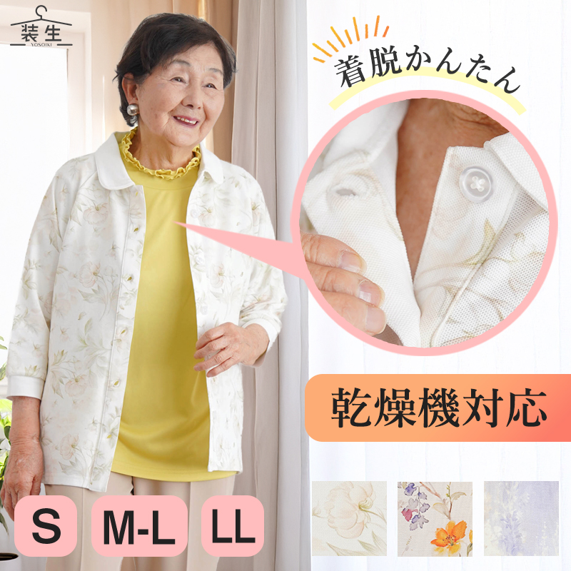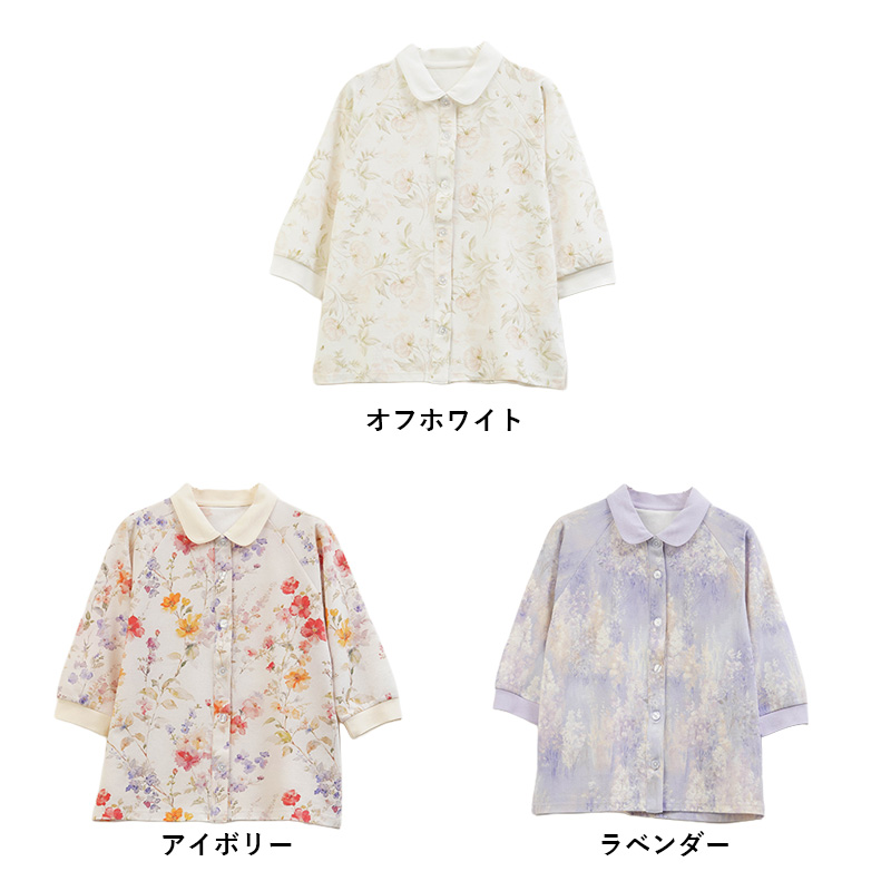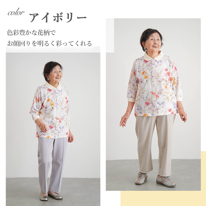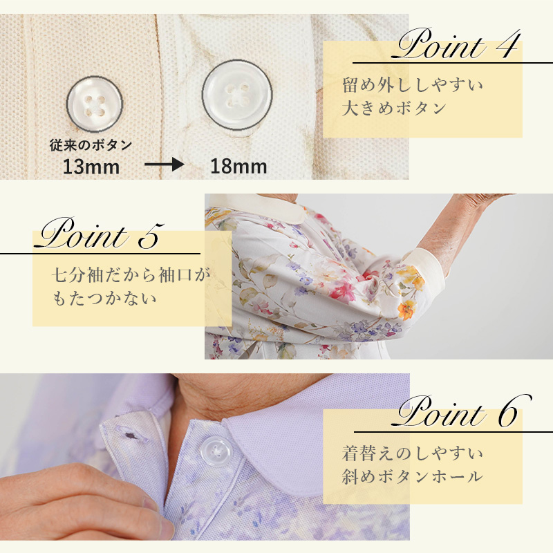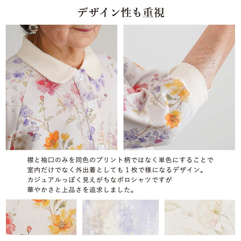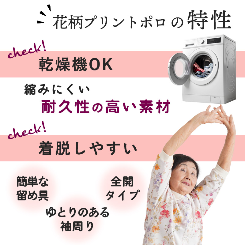 [装生] 乾燥機対応 婦人 花柄プリント 七分袖 全開ポロシャツ