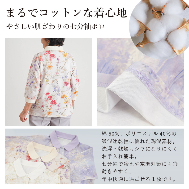 機能性と上品さを兼ね備えた、綿60%・ポリエステル40%混合の花柄プリント七分袖プリントポロシャツ。