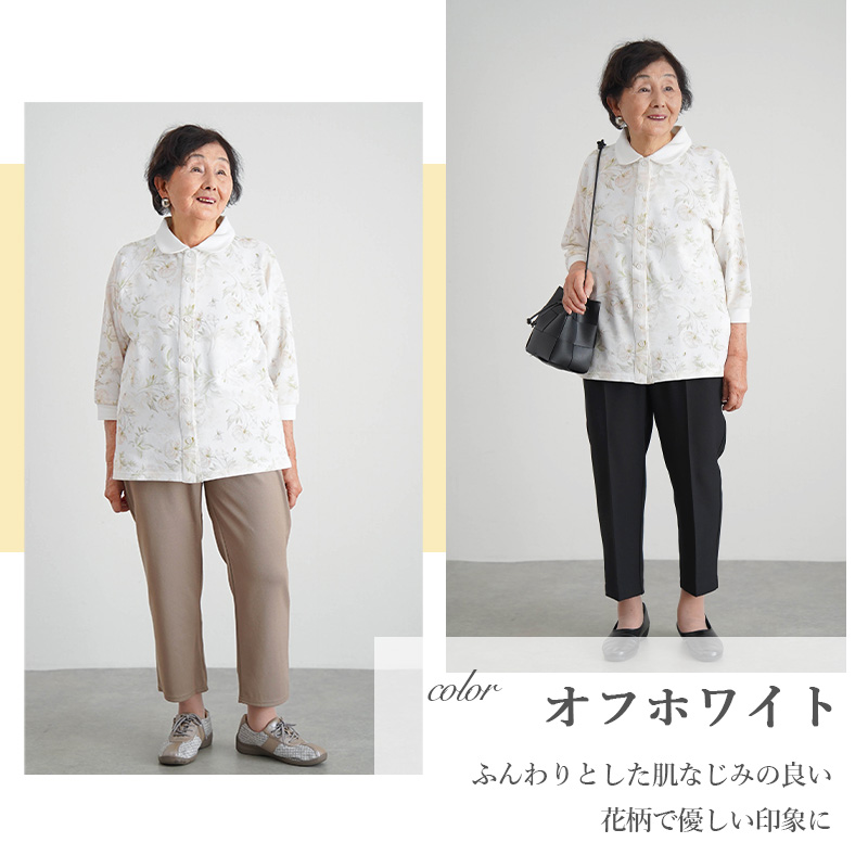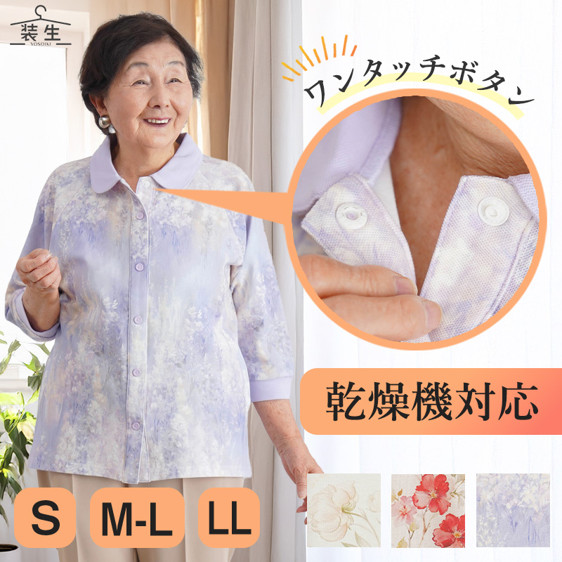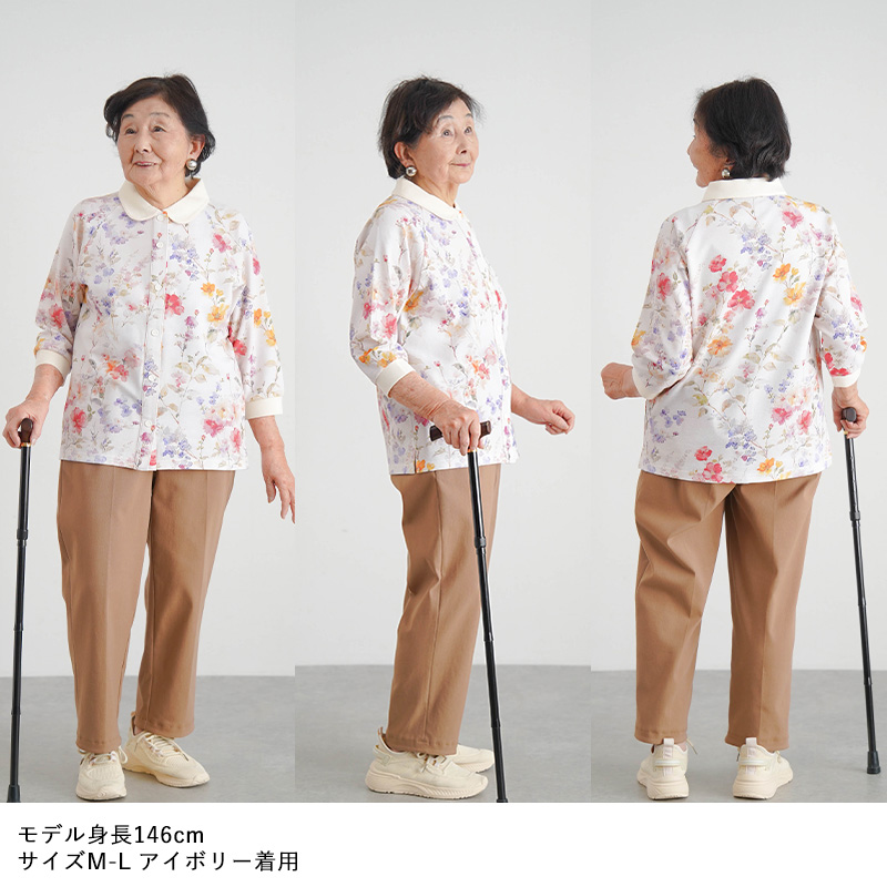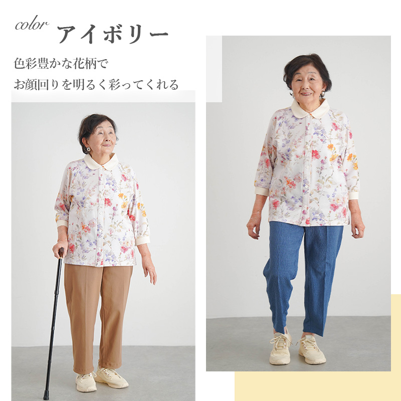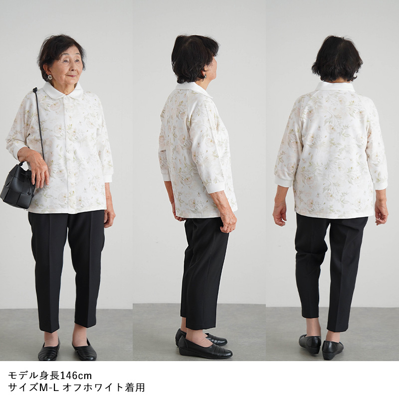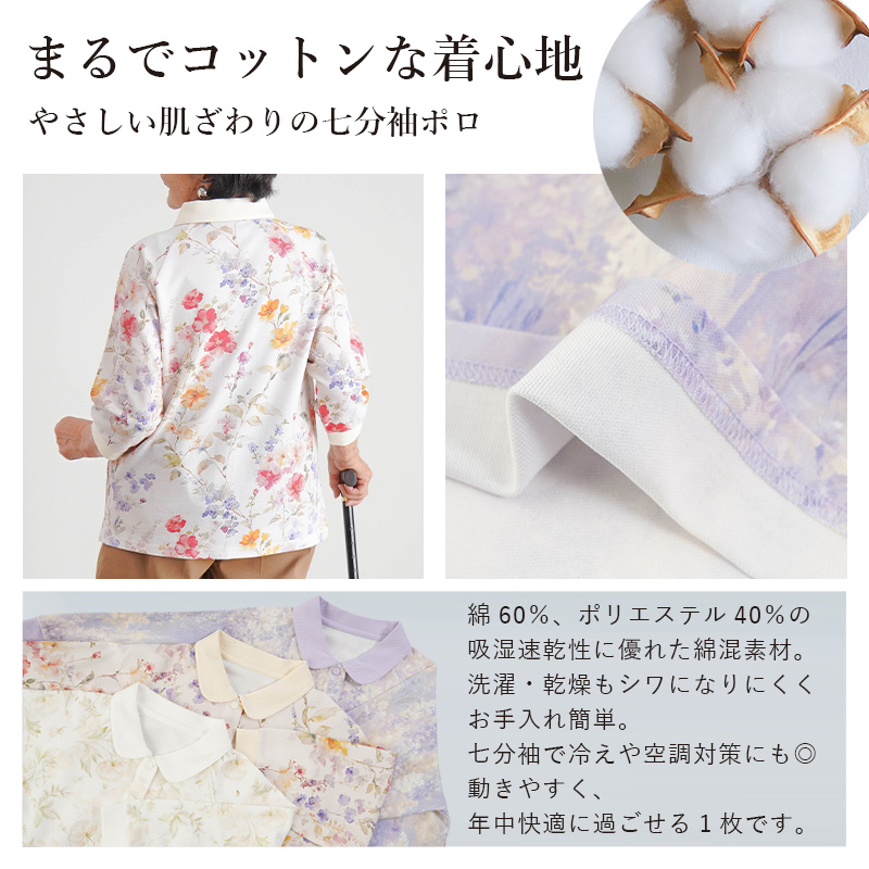 [装生] 乾燥機対応 婦人 花柄プリント 七分袖 全開スナップボタン ポロシャツ