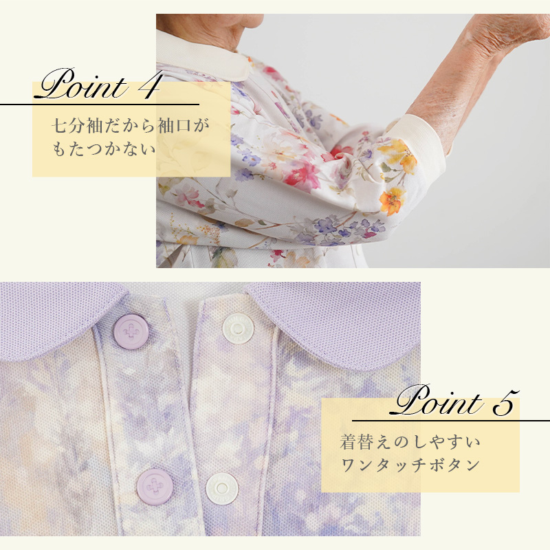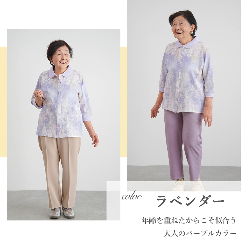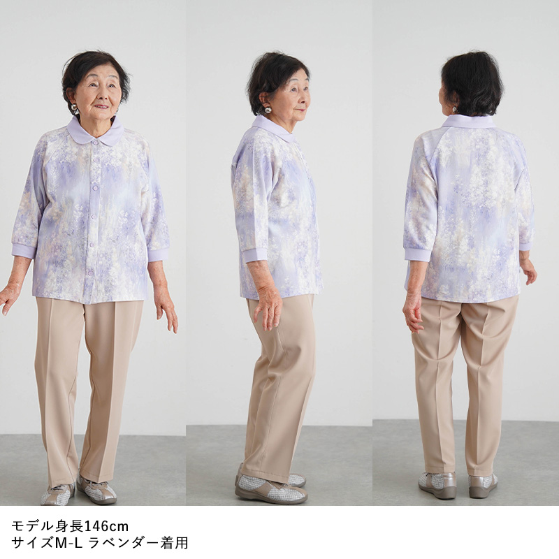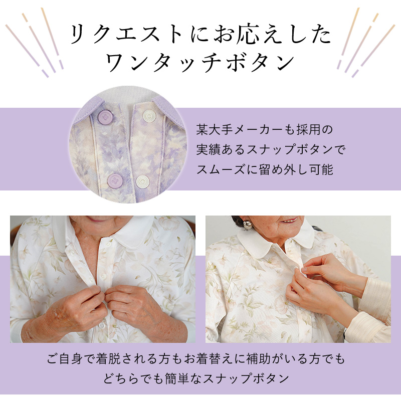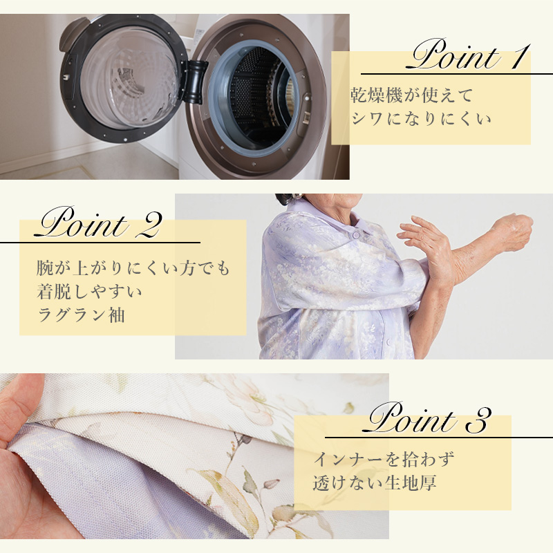 ●腕が上がりにくい方でもラクに着られるラグラン袖&前開き仕様。