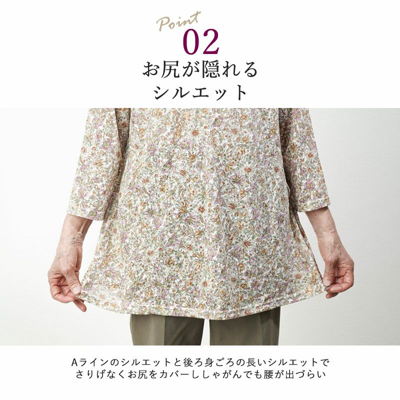 ●お腹周りはゆったりしたAラインでふんわりとカバー。七分袖で小柄な方にもおすすめ