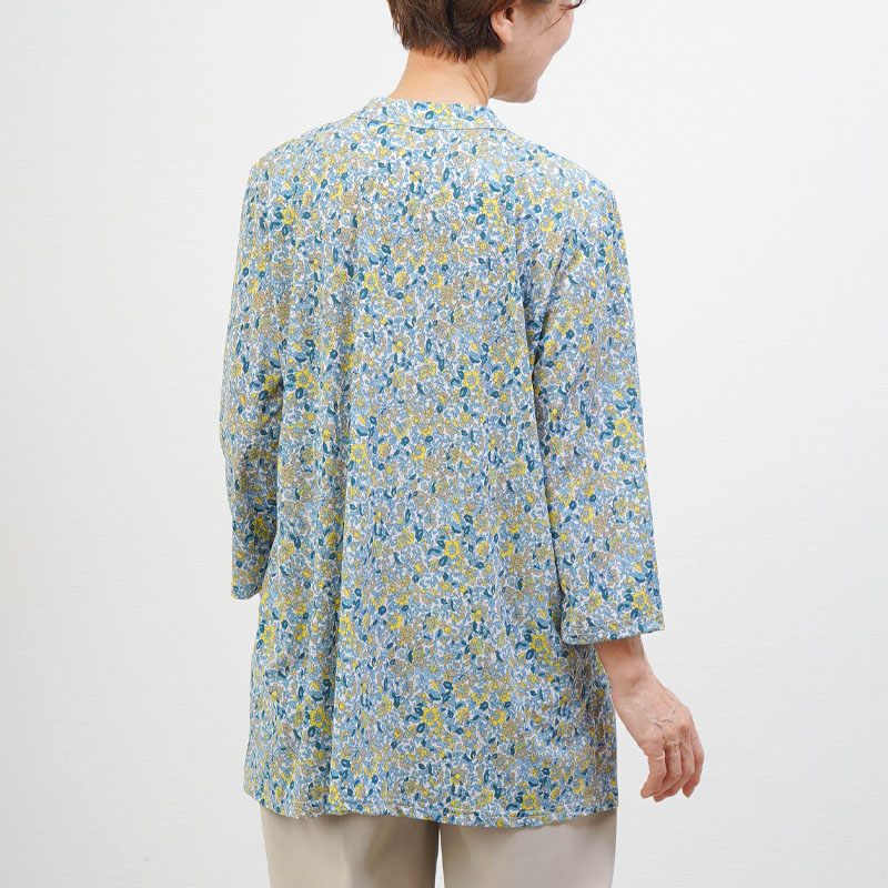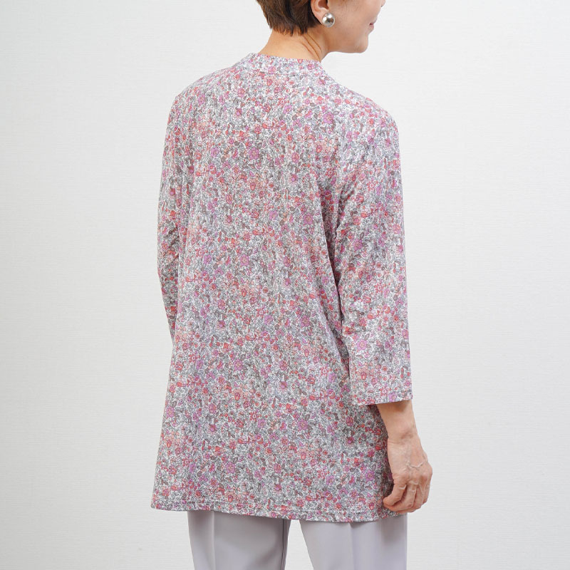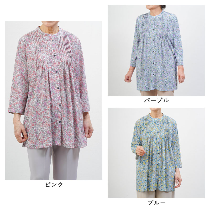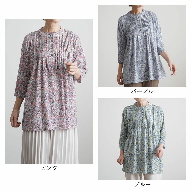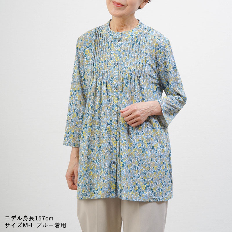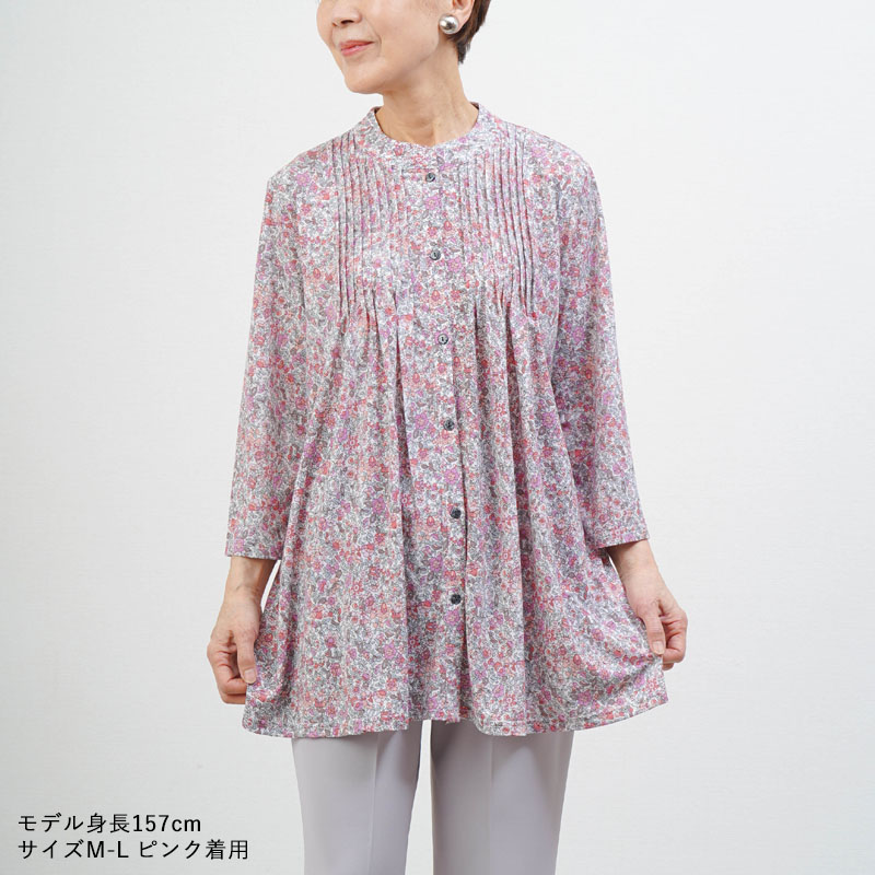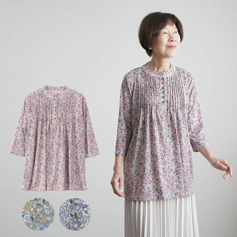 花柄 ピンタックストレッチ 七分袖ブラウス