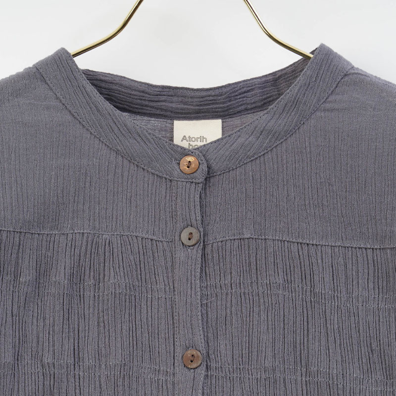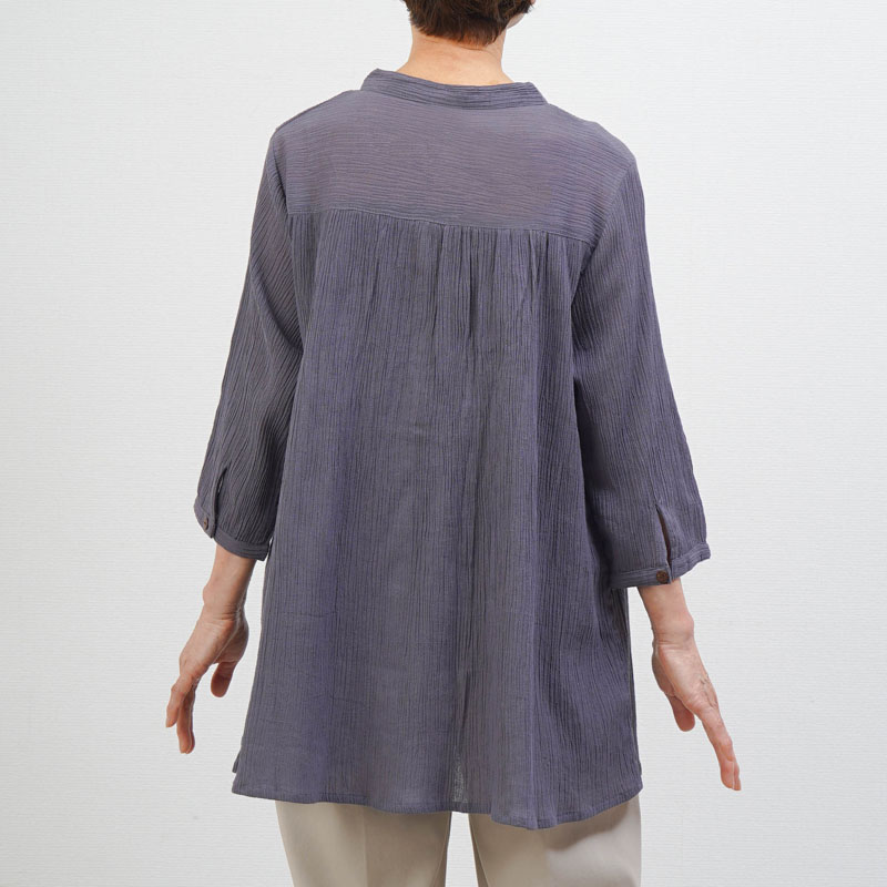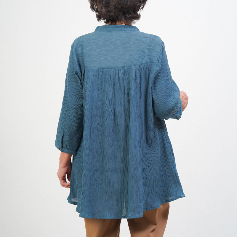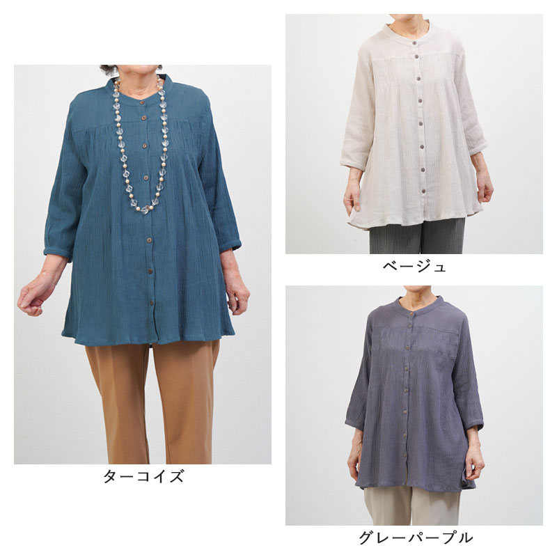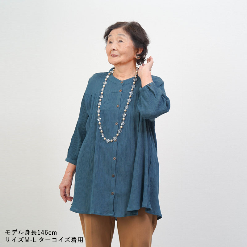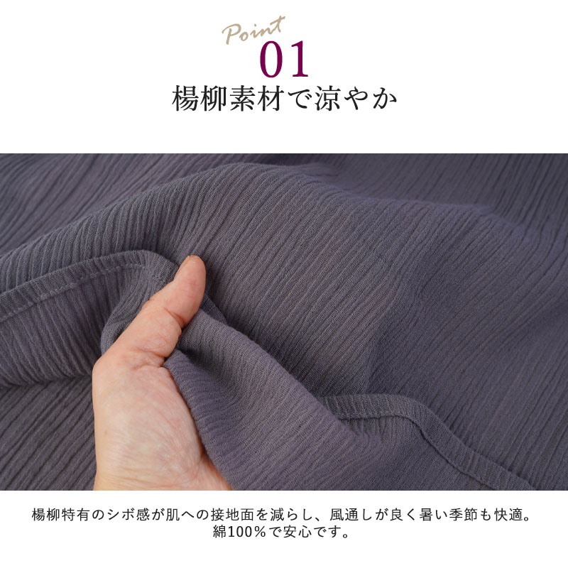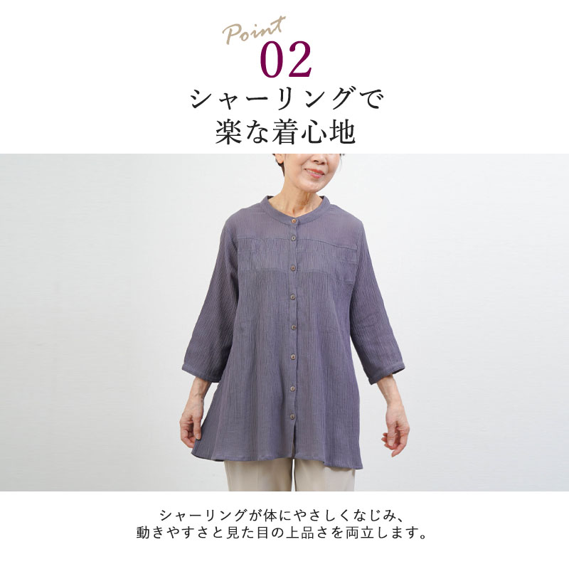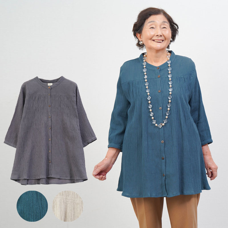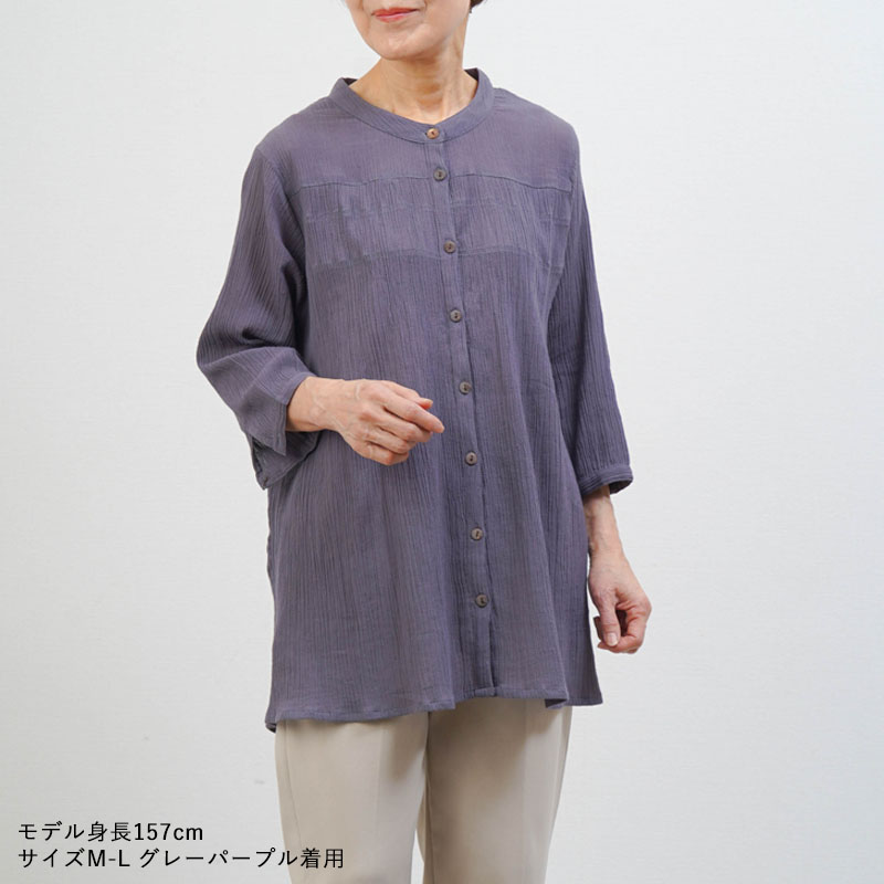 ● 綿100%の楊柳素材を使用した、肌にやさしい七分袖ブラウス。凹凸のある生地で通気性が良く、涼やかな着心地です。