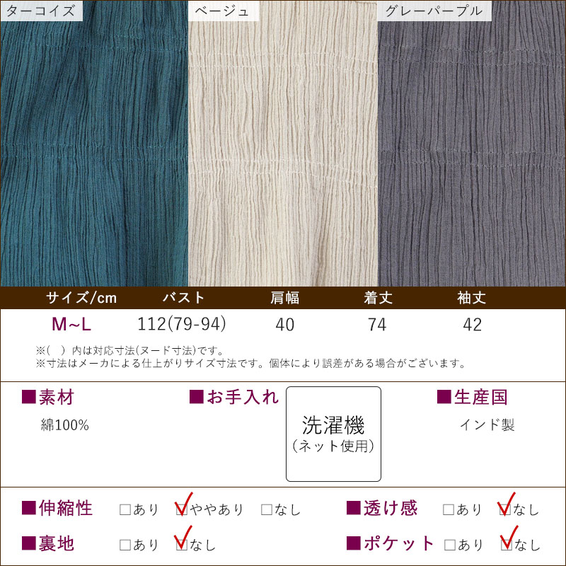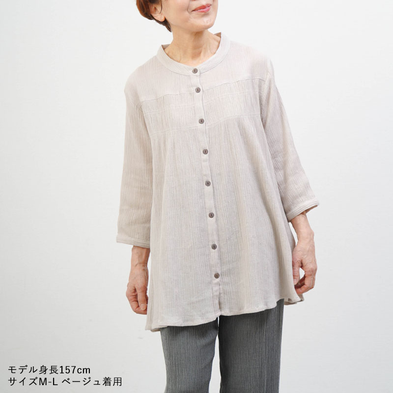 綿100% 楊柳 シャーリング入り 七分袖 ブラウス