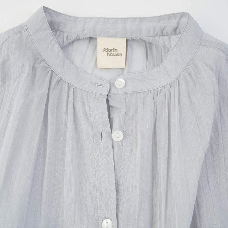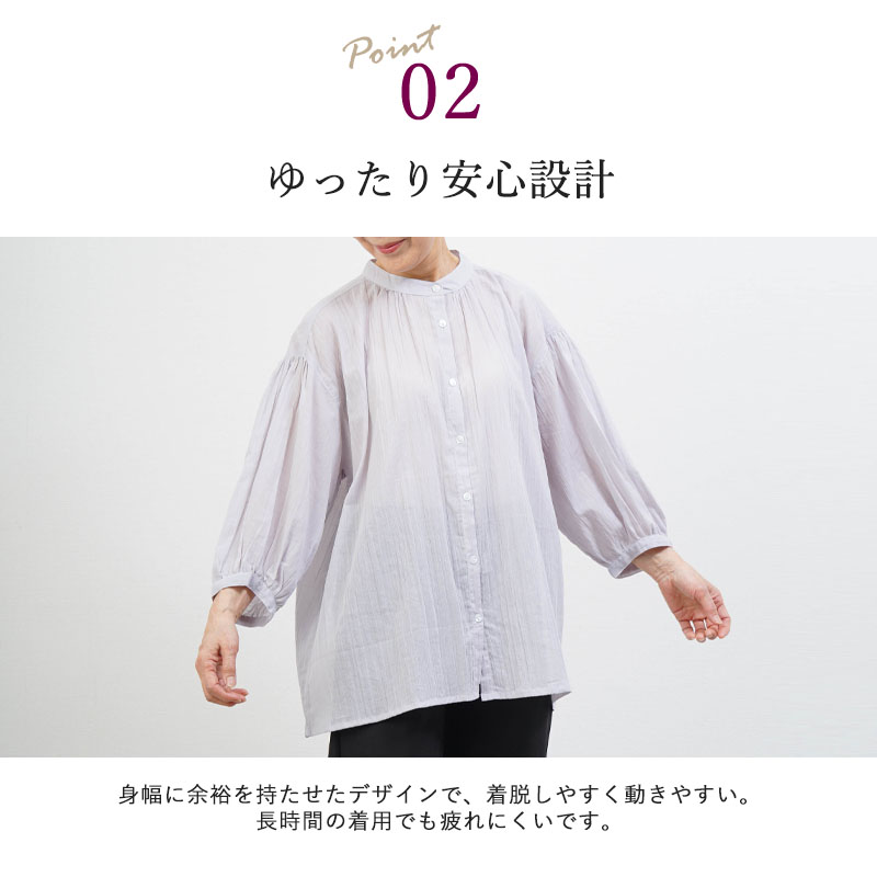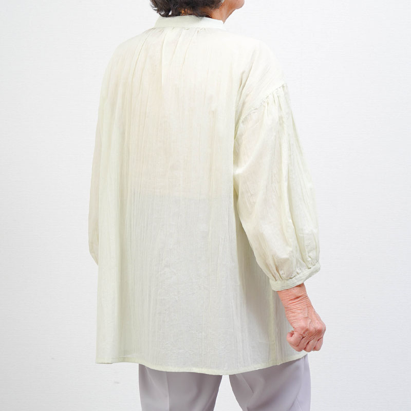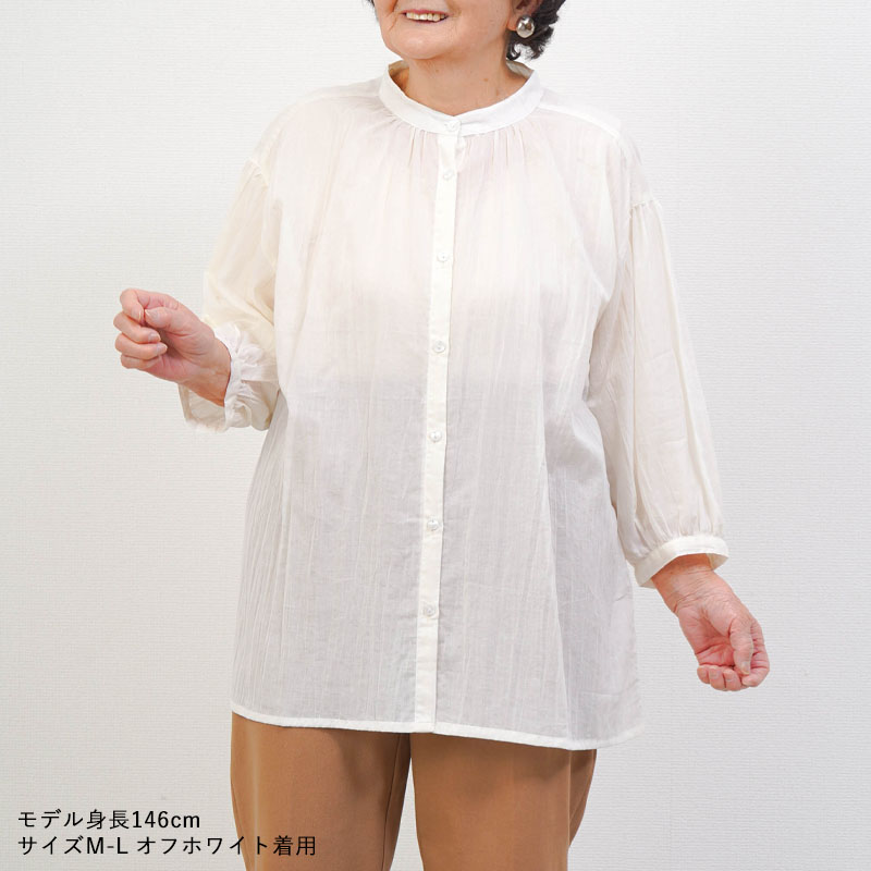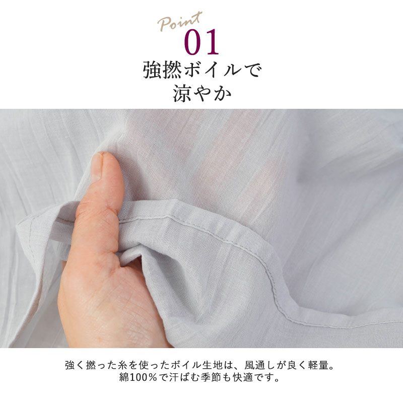 ● 強撚ボイル生地を使用した綿100%ブラウス。通気性が良く、さらっとした着心地で暑い季節も快適に過ごせます。