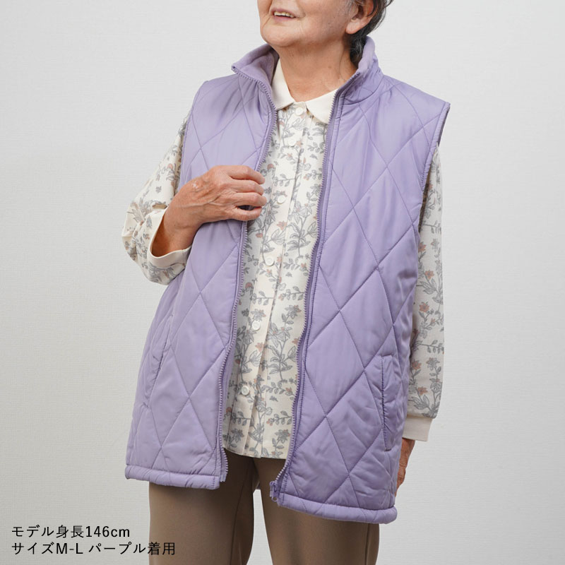 ●内側はふんわり裏フリース素材で、しっかり暖か。軽く羽織れて室内でも外出でも快適に過ごせるベストです。