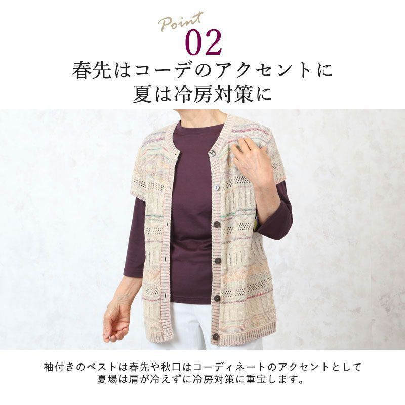 色とりどりの糸をジグザグに編み込んだ、華やかなニットベスト。