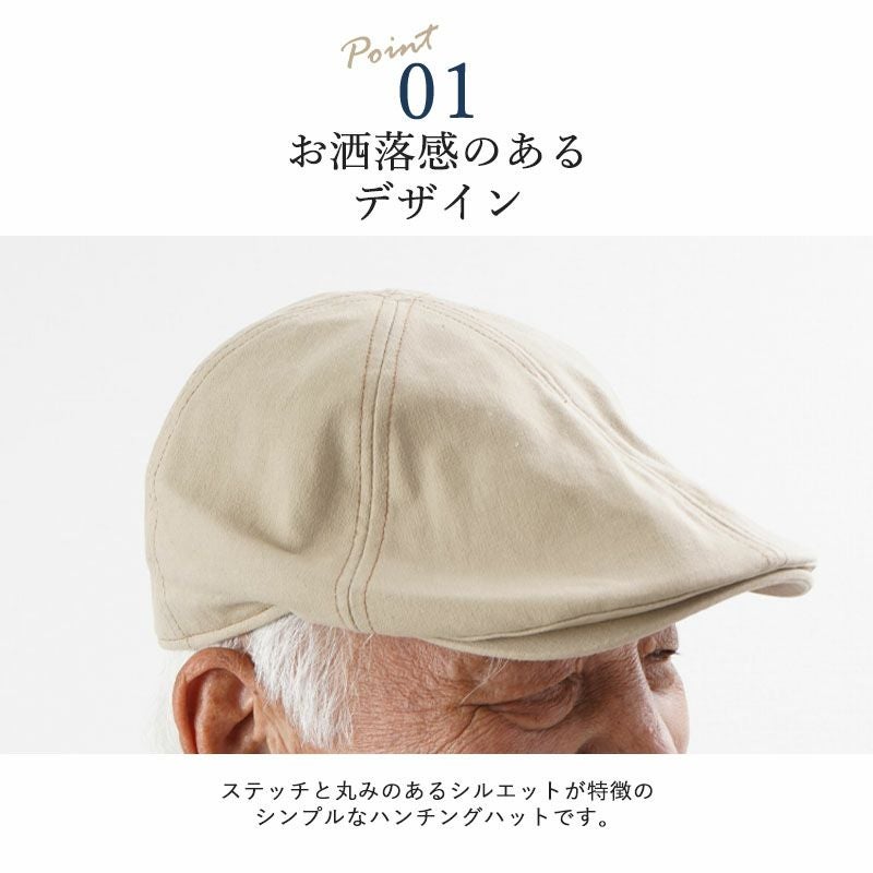 ステッチと丸みのあるシルエットが特徴のシンプルなハンチングハット。表はコットン100%で手洗い可能、裏はメッシュになっており、通気性もよく春夏に使いやすい帽子です。