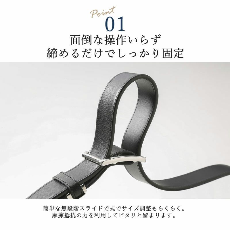 簡単な無段階スライドで式でサイズ調整もらくらくのベルト。面倒な操作いらず締めるだけでしっかり固定、摩擦抵抗の力を利用してピタリと留まります。