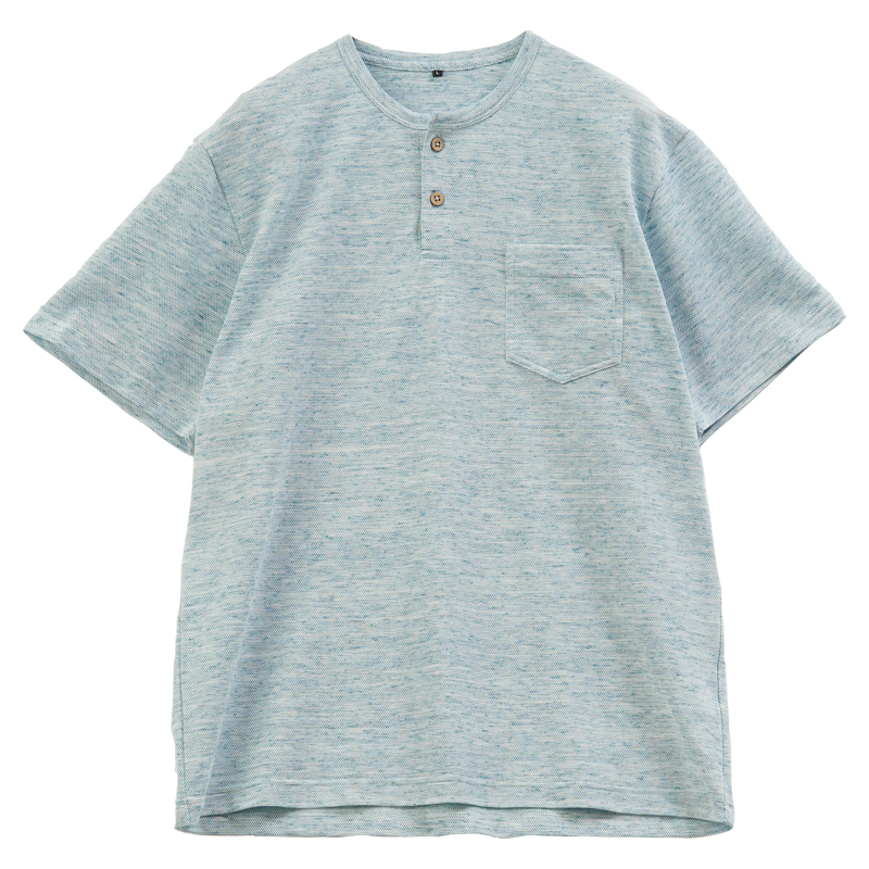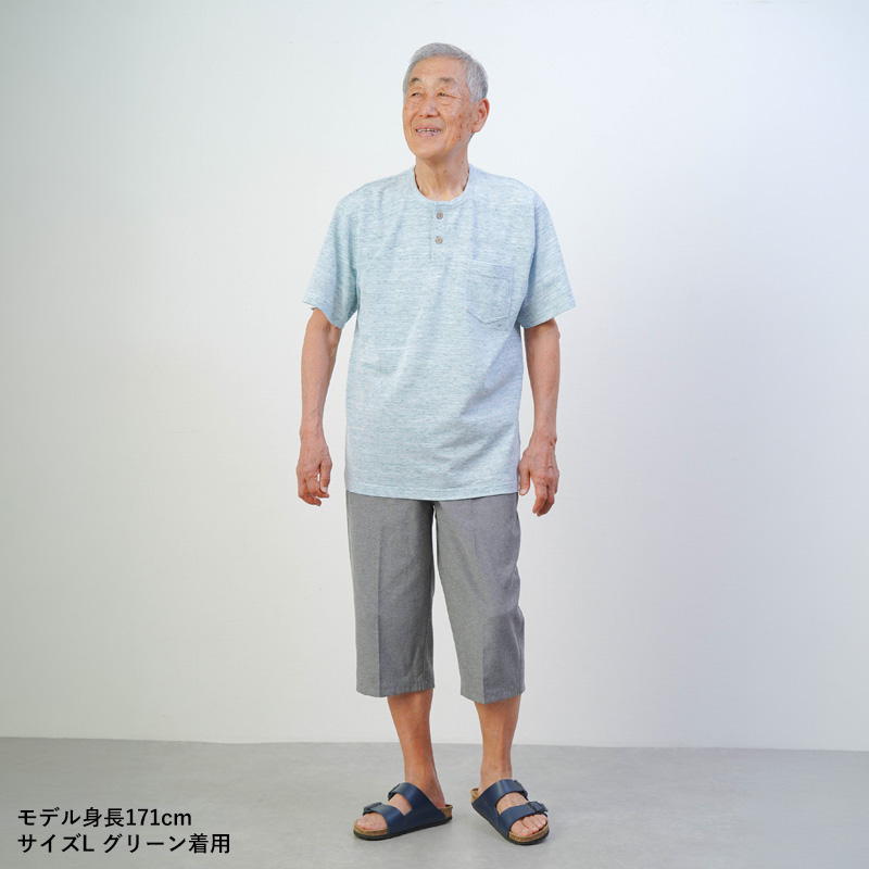 首元はボタン開閉ができるヘンリーネック仕様。頭から被りやすく、介助が必要な場面でも着脱がスムーズです。上品な杢調のデザインは、パジャマっぽく見えず、施設内でのリラックス着や外出着としても最適です。